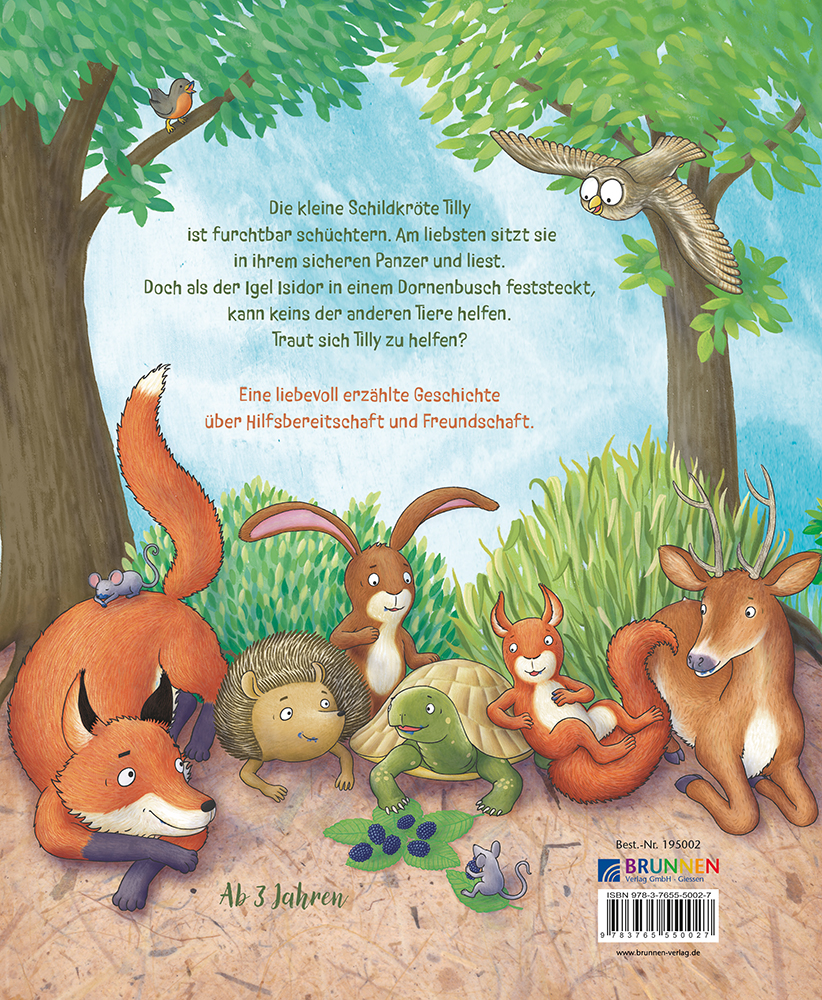 Doch eines Tages hört sie jemand weinen. Was ist bloß passiert? Tilly traut sich aus ihrem Panzer heraus und sieht den Igel Isidor, der sich in einem Dornenbusch verfangen hat. Eichhörnchen Lotti und Eule Paula sind ratlos. Wer kann dem kleinen Igel nur helfen? Es ist Tilly, die sich traut, ihre Idee in die Tat umzusetzen und sich zwischen die Dornen zu wagen. Wird ihr Plan gelingen?