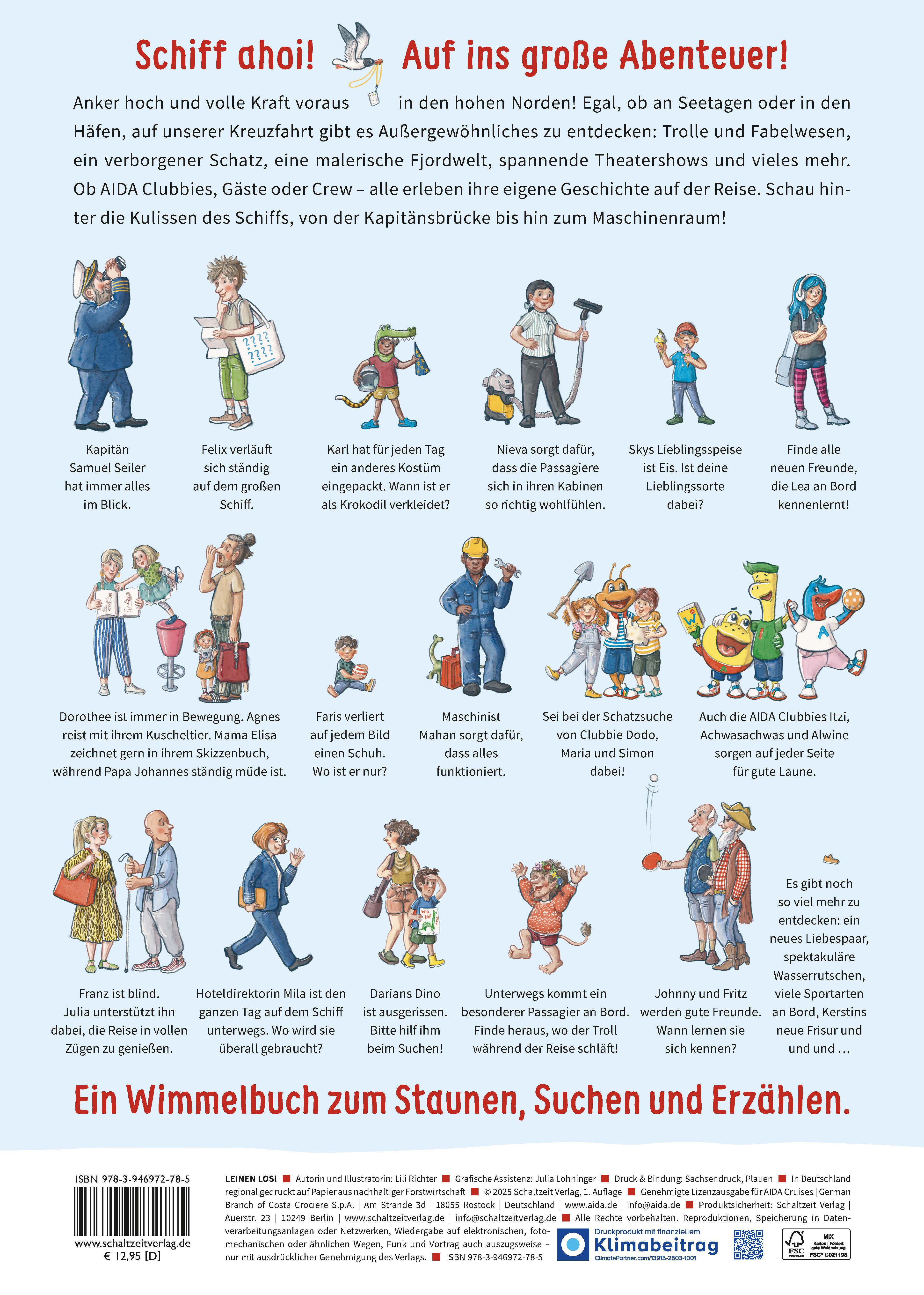 Anker hoch und volle Kraft voraus! Egal, ob an Seetagen oder in den Häfen - auf einer Kreuzfahrt in den hohen Norden gibt es viel zu erleben: ein quirliges Treiben auf dem Sonnendeck, beste Unterhaltung und spannende Theatershows, einladende Buffets, spektakuläre Wasserrutschen bis hin zu den Geheimnissen des Schiffsbauchs und der Kapitänsbrücke. Natürlich dürfen auch Ausflüge in Städte oder Fjordlandschaften sowie überraschende Begegnungen mit Fabelwesen nicht fehlen. Dieses farbenfrohe und liebevoll illustrierte Buch lädt zum Staunen, Suchen und Erzählen ein. Ob Gäste oder Crew - alle an Bord haben ihre eigene Geschichte. Auf jeder Seite warten versteckte Details und lustige Szenen darauf, von neugierigen Kinderaugen entdeckt zu werden.