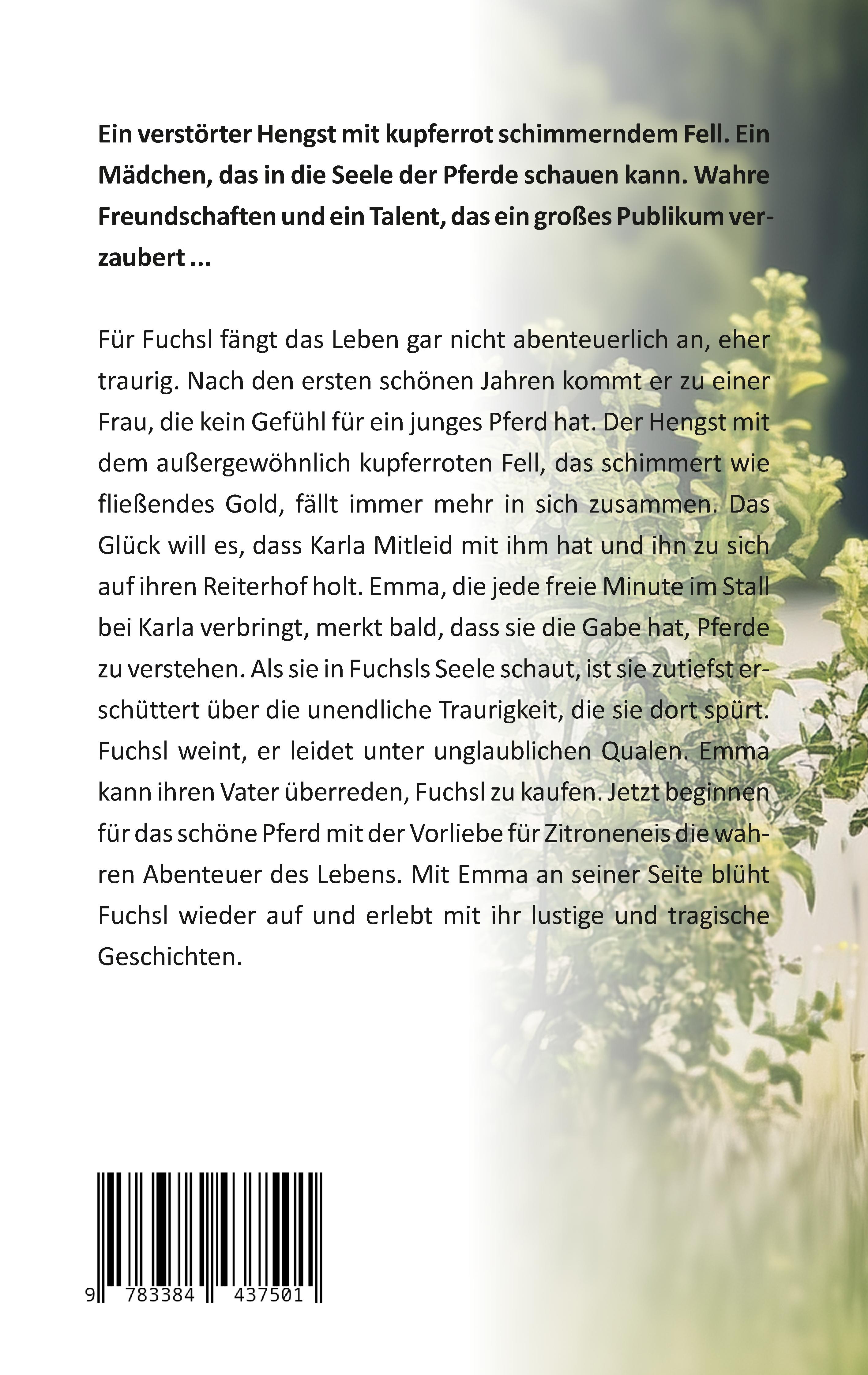 Ein verstörter Hengst mit kupferrot schimmerndem Fell. Ein Mädchen, das in die Seele der Pferde schauen kann. Wahre Freundschaften und ein Talent, das ein großes Publikum verzaubert ... Für Fuchsl fängt das Leben gar nicht abenteuerlich an, eher traurig. Nach den ersten schönen Jahren kommt er zu einer Frau, die kein Gefühl für ein junges Pferd hat. Der Hengst mit dem außergewöhnlich kupferroten Fell, das schimmert wie fließendes Gold, fällt immer mehr in sich zusammen. Das Glück will es, dass Karla Mitleid mit ihm hat und ihn zu sich auf ihren Reiterhof holt. Emma, die jede freie Minute im Stall bei Karla verbringt, merkt bald, dass sie die Gabe hat, Pferde zu verstehen. Als sie in Fuchsls Seele schaut, ist sie zutiefst erschüttert über die unendliche Traurigkeit, die sie dort spürt. Fuchsl weint, er leidet unter unglaublichen Qualen. Emma kann ihren Vater überreden, Fuchsl zu kaufen. Jetzt beginnen für das schöne Pferd mit der Vorliebe für Zitroneneis die wahren Abenteuer des Lebens. Mit Emma an seiner Seite blüht Fuchsl wieder auf und erlebt mit ihr lustige und tragische Geschichten.