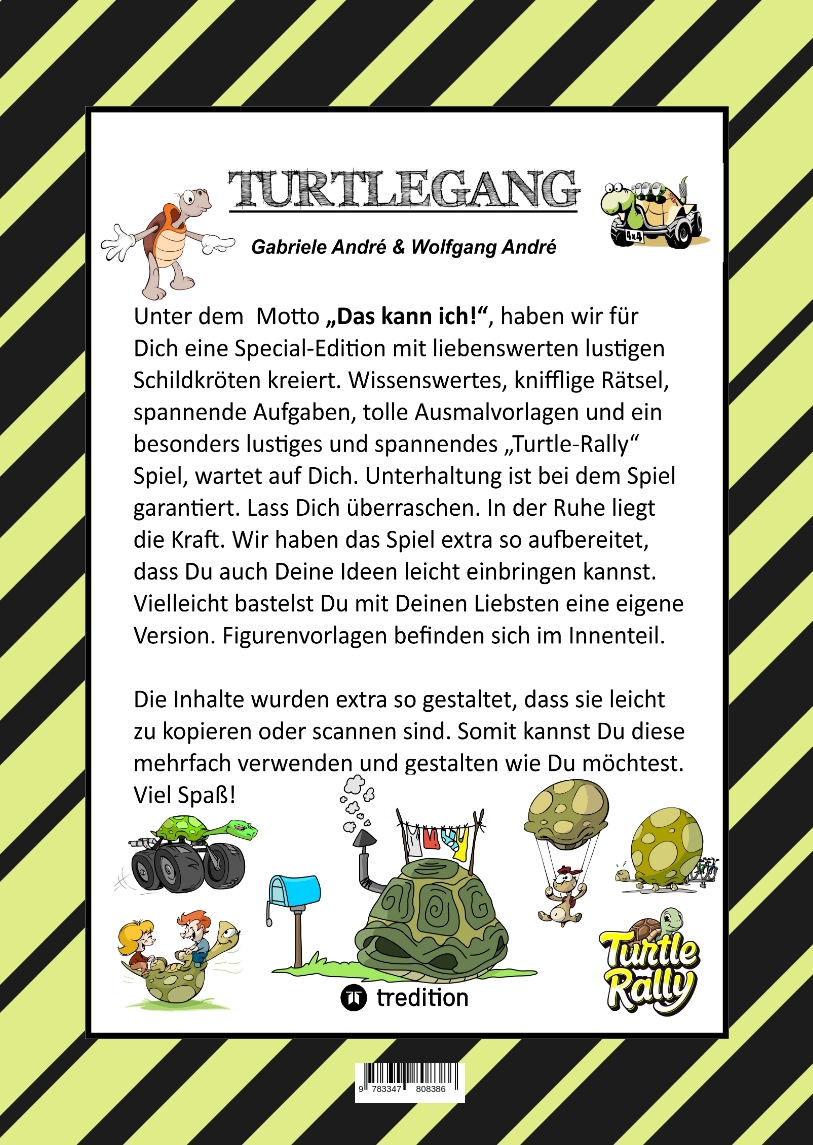 | Schlagworte | Artenschutz • Ausmalvorlagen • Basteln • Bilder gestalten • Craftbook • Entdecken • Erfinden • Familie • Freunde • gemeinsame Zeit • Ideenfindung • knifflige Rätsel • Kreativität • Lebensraum • Lernen • lustig • Malen • Schaffungsprozess • Schildkröten • Schule • spannend • Spannende Unterhaltung • Spieleabend • Spielen • Tiere • Tierwelt • Turtle • TURTLE-RALLY • üben • Wissen • witzige motive • Zeichnen |