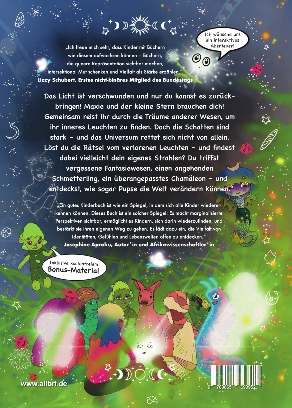 Die schüchterne Blume Maxie und ihr Begleiter, der kluge kleine Stern, begeben sich auf eine Abenteuerreise durch die Träume, um die Rätsel vom verlorenen Leuchten zu lösen! Dabei sammeln die beiden durch jeden Traum wertvolle Lebenserfahrungen. Durch vielfältige Begegnungen - mit vergessenen Fantasiewesen, einem angehenden Schmetterling, einem überangepassten Chamäleon, den machthungrigen Sonnen, einem überforderten Funken oder einem ausgenutzten Delfin - lernen sie die Welt und sich selbst verstehen.Ein humorvolles, berührendes Mitmach-Buch für kleine und große Kinder, die sich selbst entdecken und glücklich leben wollen!
