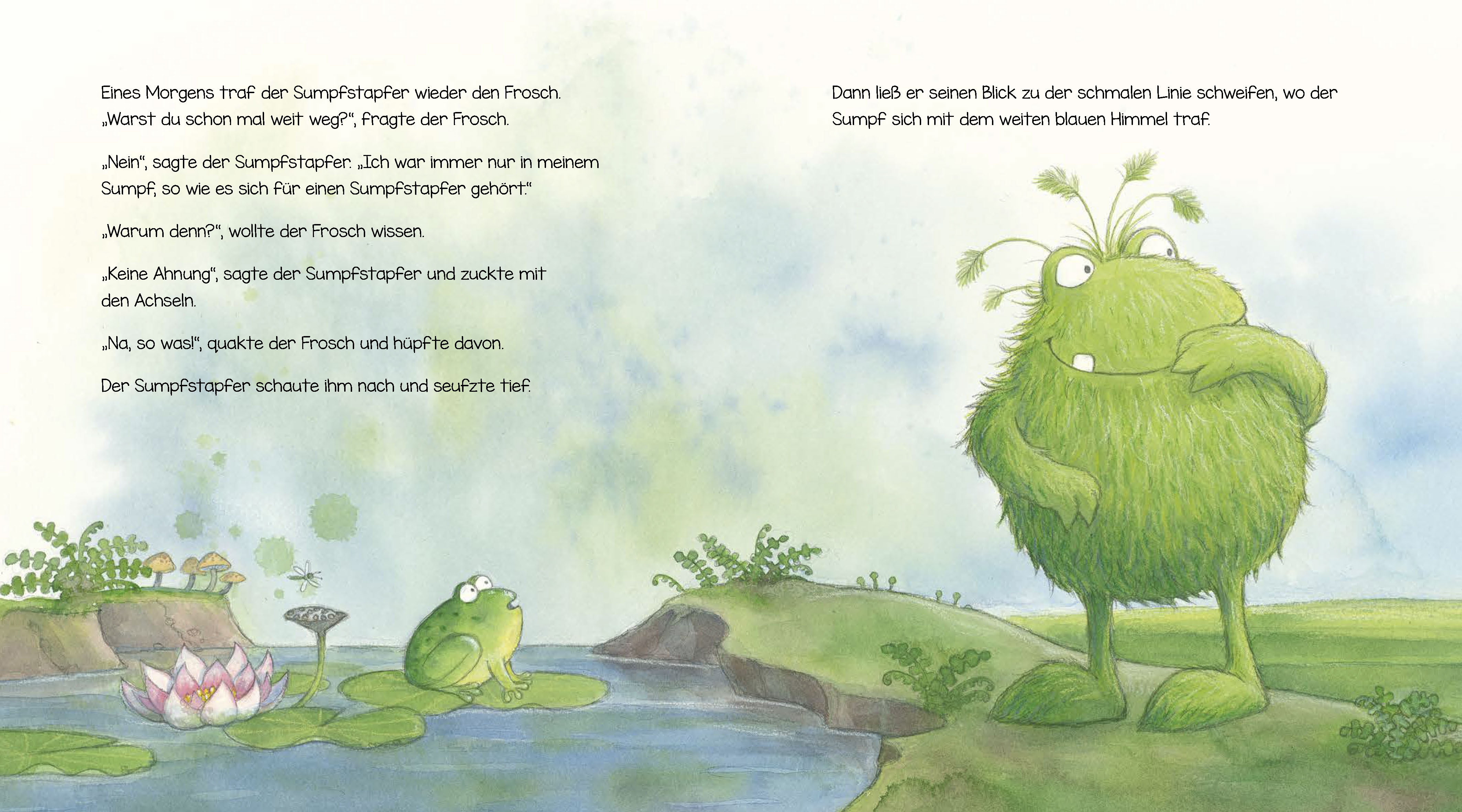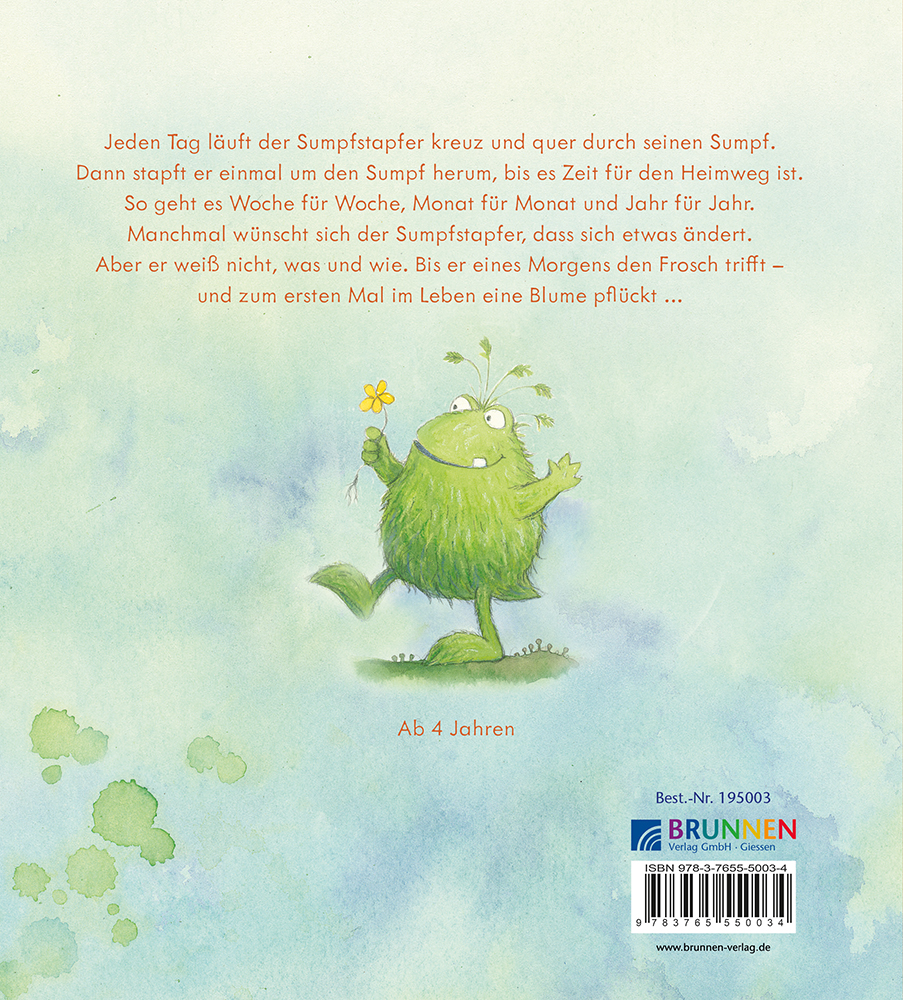 Jeden Tag geht der Sumpfstapfer seinem gewohnten Rhythmus nach: Stapfen, immer im selben Takt, Tag für Tag. Doch tief in ihm wächst der Wunsch nach Veränderung, nach etwas Neuem. Als er eines Morgens den Frosch trifft und zum ersten Mal im Leben eine Blume pflückt, verändert sich sein Leben und es eröffnet sich ihm eine ganz neue Welt.