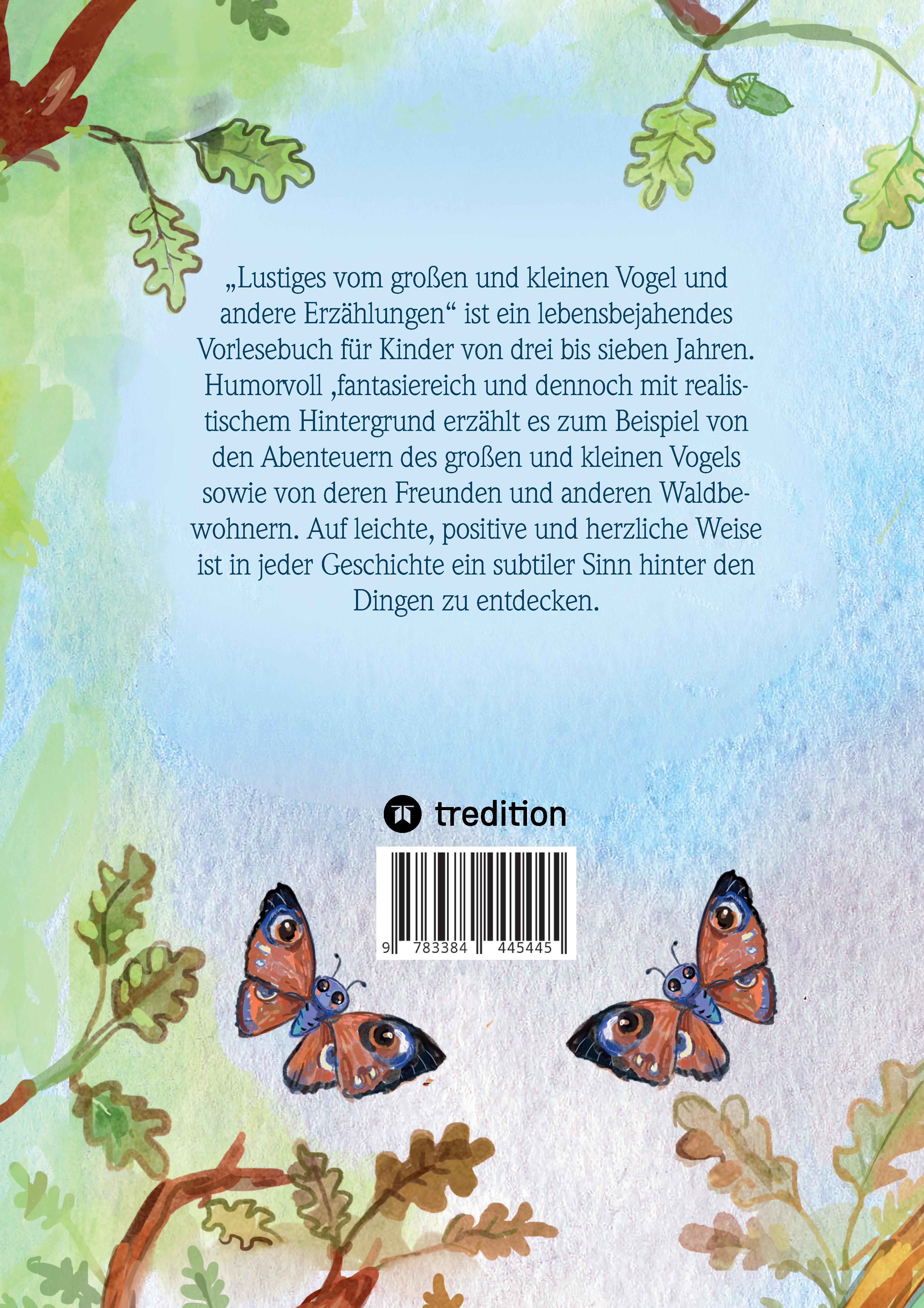 Lustiges vom kleinen und vom großen Vogel ist ein lebensbejahendes Vorlesebuch für Kinder im Alter von 4-7 Jahren. Humorvoll ,fantasiereich und dennoch mit realem Bezug zu dem Leben der Kinder erzählt es zum Beispiel von den Abenteuern des kleinen und des großen Vogels sowie deren Freunden und den anderen Waldbewohnern. Auf leichte, positive und herzliche Weise ist in jeder Geschichte ein subtiler Sinn hinter den Dingen zu entdecken