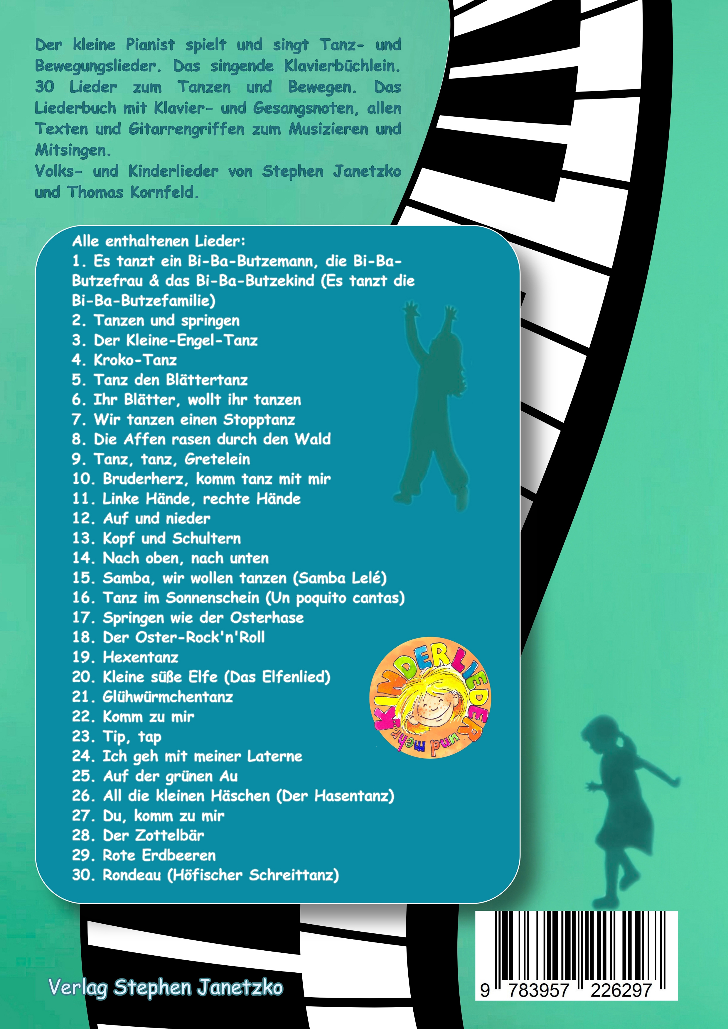 Der kleine Pianist spielt und singt Tanz- und Bewegungslieder. Das singende Klavierbüchlein. 30 Lieder zum Tanzen und Bewegen. Das Liederbuch mit Klavier- und Gesangsnoten, allen Texten und Gitarrengriffen zum Musizieren und Mitsingen. Volks- und Kinderlieder von Stephen Janetzko und Thomas Kornfeld. "Gibt es eventuell auch von all den vielen schönen Liedern des Verlages kurze und leichte Klavierstücke für Anfänger?" Wir freuen uns, diese Frage nun mit "Ja!" zu beantworten und können hier zu vielen Liedern leichte bis mittelschwere Klaviersätze anbieten. Wir wollen sogar noch einen Schritt weitergehen: Warum nur Klavier spielen und nicht auch noch dazu singen? Beides gemeinsam stellt hohe Ansprüche an die Musikalität der Kinder und ist eine anspruchsvolle künstlerische Aufgabe. Viel Freude und Spaß haben die Kinder beim Singen und Musizieren natürlich auch durch den Rhythmus der Musik, der "sofort ins Blut geht" und zur Bewegung und zum Tanzen herausfordert. Dieses Album ist deshalb in besonderem Maße eine Sammlung von Tanz- und Bewegungsliedern. Wir haben neben den üblichen Vokalnoten mit Text und Gitarrenharmonien den Klaviersatz mit einer Gesangstimme gegenübergestellt. Der Klaviersatz gibt die Melodie des Liedes detailgetreu wieder. So kann jeder selbst entscheiden welche Fassung des Liedes musiziert werden soll, egal ob als eigenständiger Klaviervortrag oder als Klavierbegleitung zum Klassengesang, für die Chorarbeit oder den Sologesang. Darüber hinaus stellen wir alle Klaviersätze zu Demonstrationszwecken als Audios zum Download bereit. Viel Freude und Erfolg beim Klavierspielen und Singen wünschen die Autoren. PS. Weitere Ausgaben in selber Aufmachung sind in dieser Reihe zu weiteren Themen erhältlich und in Vorbereitung. Alle enthaltenen Lieder: 1. Es tanzt ein Bi-Ba-Butzemann, die Bi-Ba-Butzefrau & das Bi-Ba-Butzekind (Es tanzt die Bi-Ba-Butzefamilie) 2. Tanzen und springen 3. Der Kleine-Engel-Tanz 4. Kroko-Tanz 5. Tanz den Blättertanz 6. Ihr Blätter, wollt ihr tanzen 7. Wir tanzen einen Stopptanz 8. Die Affen rasen durch den Wald 9. Tanz, tanz, Gretelein 10. Bruderherz, komm tanz mit mir 11. Linke Hände, rechte Hände 12. Auf und nieder 13. Kopf und Schultern 14. Nach oben, nach unten 15. Samba, wir wollen tanzen (Samba Lelé) 16. Tanz im Sonnenschein (Un poquito cantas) 17. Springen wie der Osterhase 18. Der Oster-Rock'n'Roll 19. Hexentanz 20. Kleine süße Elfe (Das Elfenlied) 21. Glühwürmchentanz 22. Komm zu mir 23. Tip, tap 24. Ich geh mit meiner Laterne 25. Auf der grünen Au 26. All die kleinen Häschen (Der Hasentanz) 27. Du, komm zu mir 28. Der Zottelbär 29. Rote Erdbeeren 30. Rondeau (Höfischer Schreittanz) Zu diesem Klavierbüchlein ist separat ein Download/Streaming-Album mit allen Klaviersätzen zum Anhören erschienen.