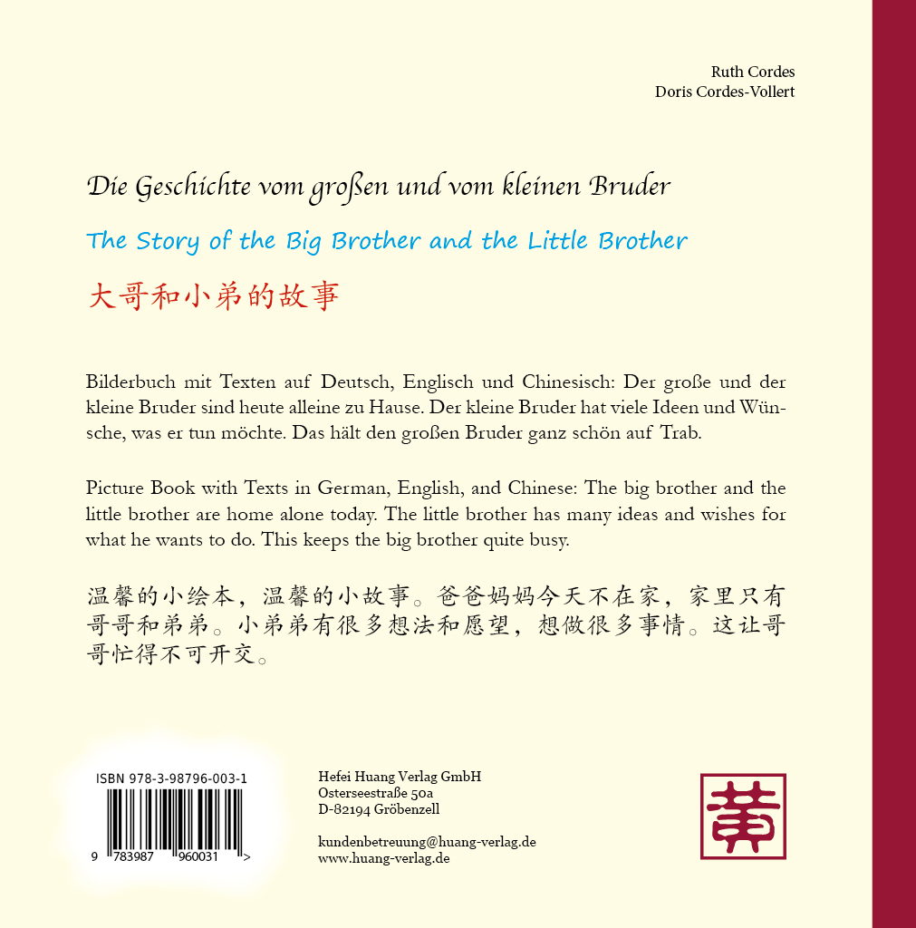 Bilderbuch mit Texten auf Deutsch, Englisch und Chinesisch: Der große und der kleine Bruder sind heute alleine zu Hause. Der kleine Bruder hat viele Ideen und Wünsche, was er tun möchte. Das hält den großen Bruder ganz schön auf Trab. Picture Book with Texts in German, English, and Chinese: The big brother and the little brother are home alone today. The little brother has many ideas and wishes for what he wants to do. This keeps the big brother quite busy. 温馨的小绘本,温馨的小故事。爸爸妈妈今天不在家,家里只有哥哥和弟弟。小弟弟有很多想法和愿望,想做很多事情。这让哥哥忙得不可开交。