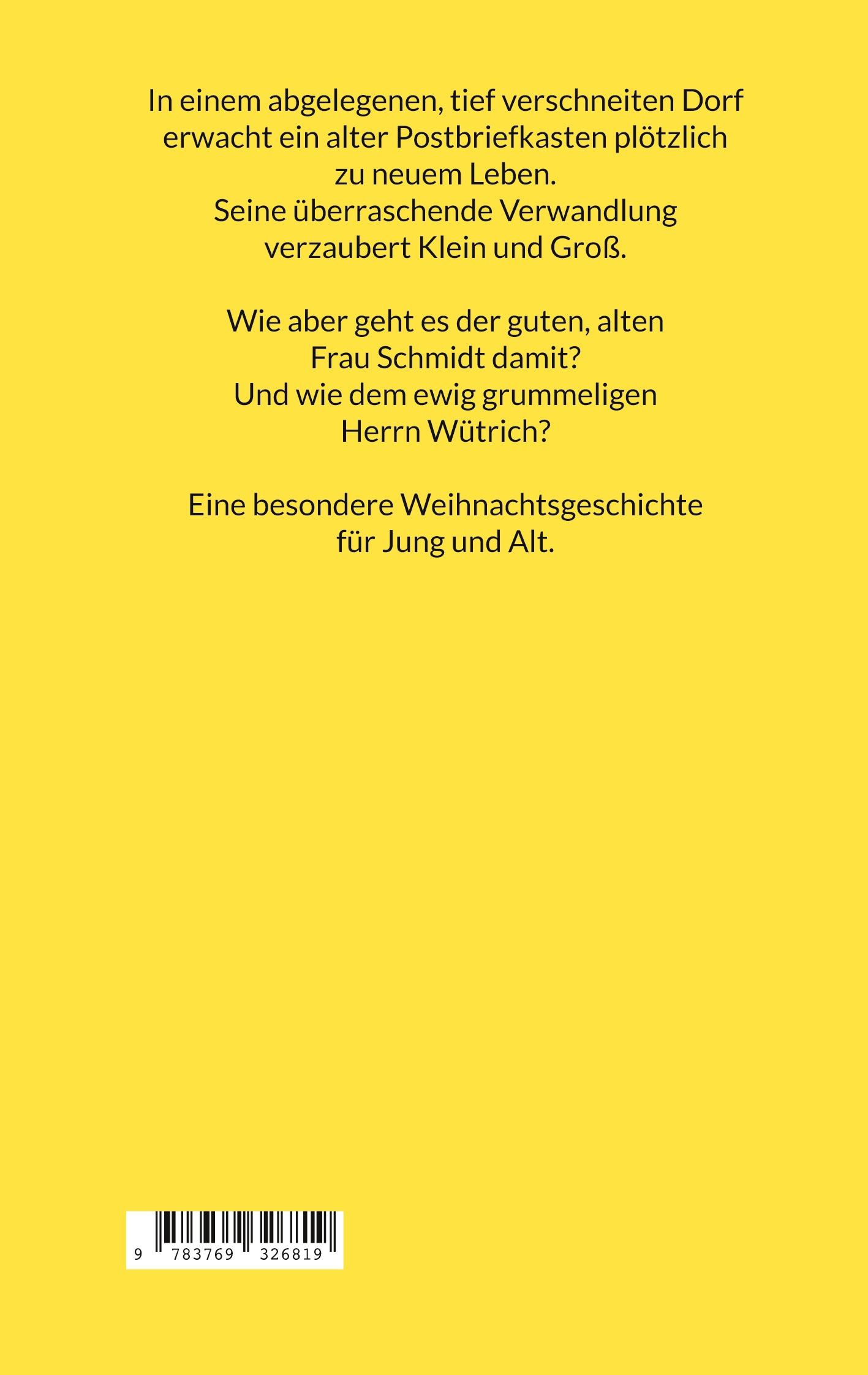 In einem abgelegenen, tief verschneiten Dorf erwacht ein alter Postbriefkasten plötzlich zu neuem Leben. Seine überraschende Verwandlung verzaubert Klein und Groß. Wie geht es der guten, alten Frau Schmidt damit? Und dem grummeligen Herrn Wütrich? Eine Weihnachtsgeschichte der ganz besonderen Art!