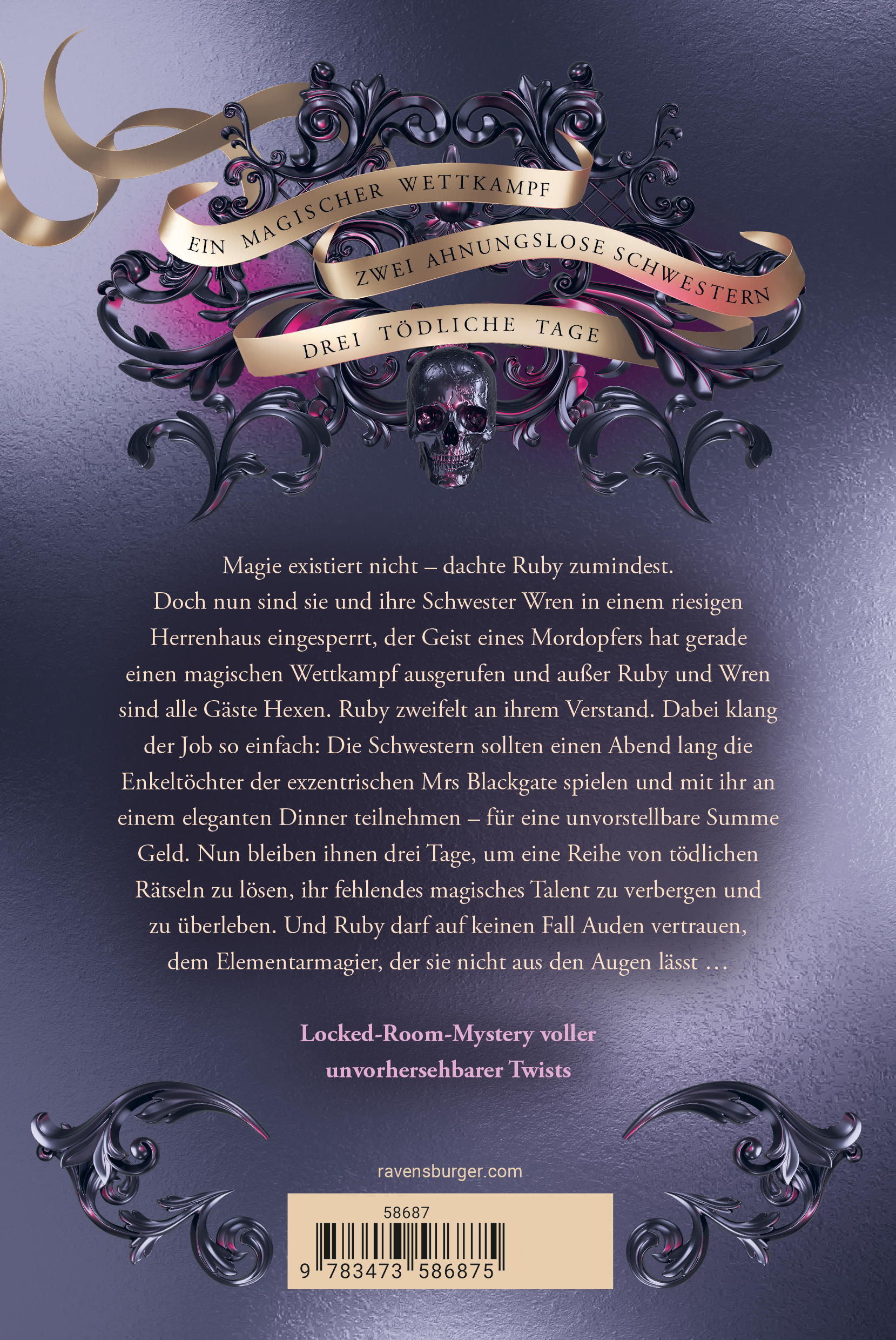 Der Job klang leicht: Die Schwestern Ruby und Wren sollten einen Abend lang die Enkeltöchter der exzentrischen Mrs Blackgate spielen – während eines Dinners im legendären Hegemony Manor. Doch nun sind sie im Herrenhaus eingesperrt, ein Geist hat einen Wettkampf ausgerufen und außer ihnen sind alle Gäste Hexen. Um zu überleben, müssen sie innerhalb von drei Tagen eine Reihe von Rätseln lösen. Und Ruby darf auf keinen Fall Auden vertrauen, dem Elementarmagier, der sie nicht aus den Augen lässt …
