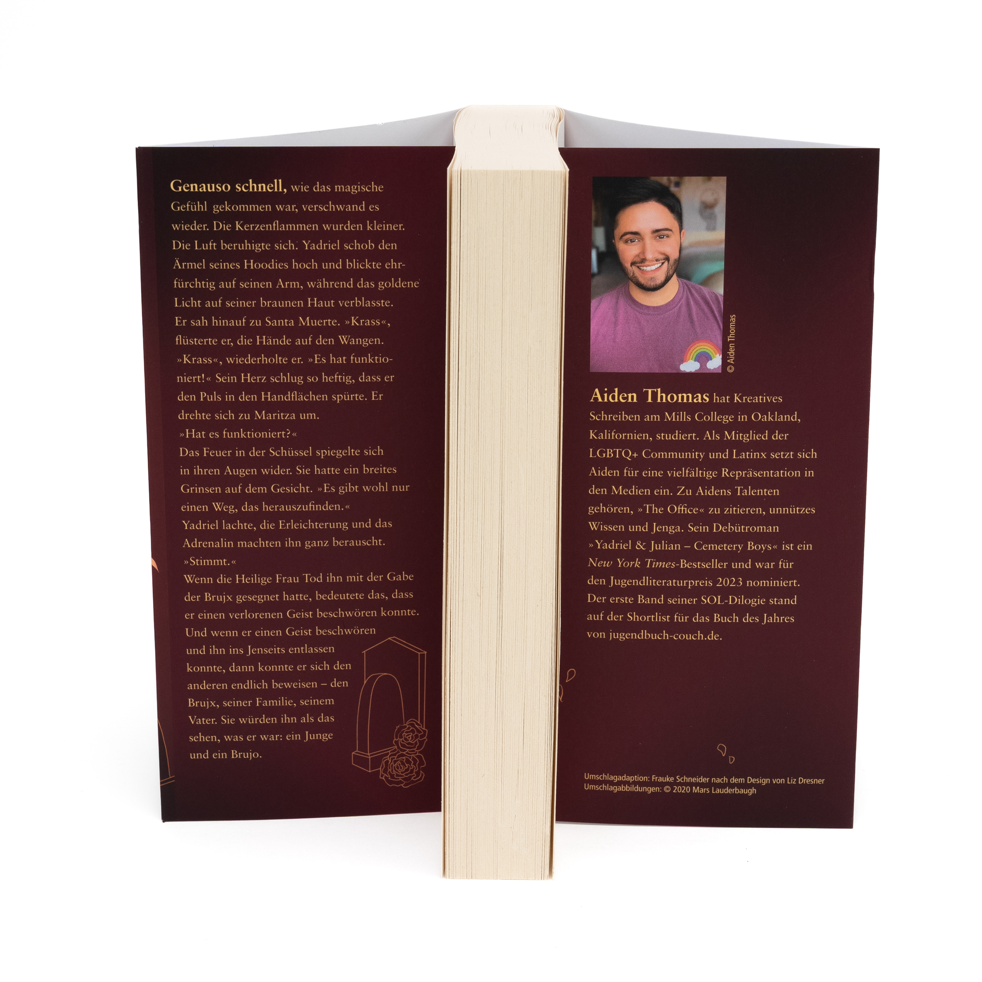 Aiden Thomas hat Kreatives Schreiben am Mills College in Oakland, Kalifornien, studiert. Als Mitglied der LGBTQ+ Community und Latinx setzt sich Aiden für eine vielfältige Repräsentation in den Medien ein. Zu Aidens Talenten gehören »The Office« zu zitieren, unnützes Wissen und Jenga. Sein Debütroman »Yadriel & Julian – Cemetery Boys« ist ein New York Times-Bestseller und war für den Jugendliteraturpreis 2023 nominiert. Band 1 der SOL-Dilogie stand auf der Shortlist für das Buch des Jahres von jugendbuch-couch.de.