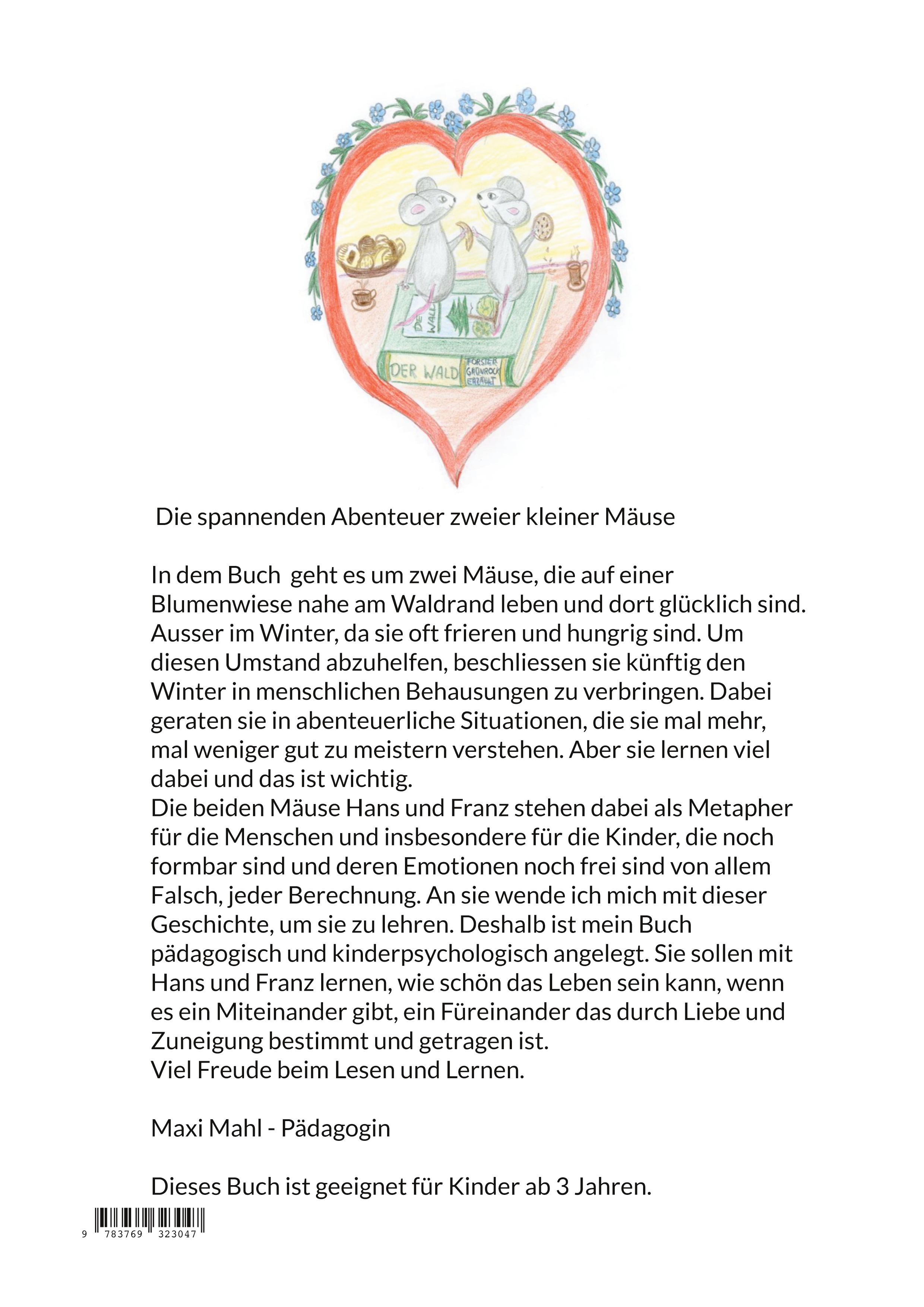 Die beiden Mäuse Hans und Franz stehen dabei als Metapher für die Menschen und insbesondere für die Kinder, die noch formbar sind und deren Emotionen noch frei sind von allem Falsch, jeder Berechnung. An sie wende ich mich mit dieser Geschichte, um sie zu lehren. Deshalb ist mein Buch pädagogisch und kinderpsychologisch angelegt. Sie sollen mit Hans und Franz lernen, wie schön das Leben sein kann, wenn es ein Miteinander gibt, ein Füreinander das durch Liebe und Zuneigung bestimmt und getragen ist.