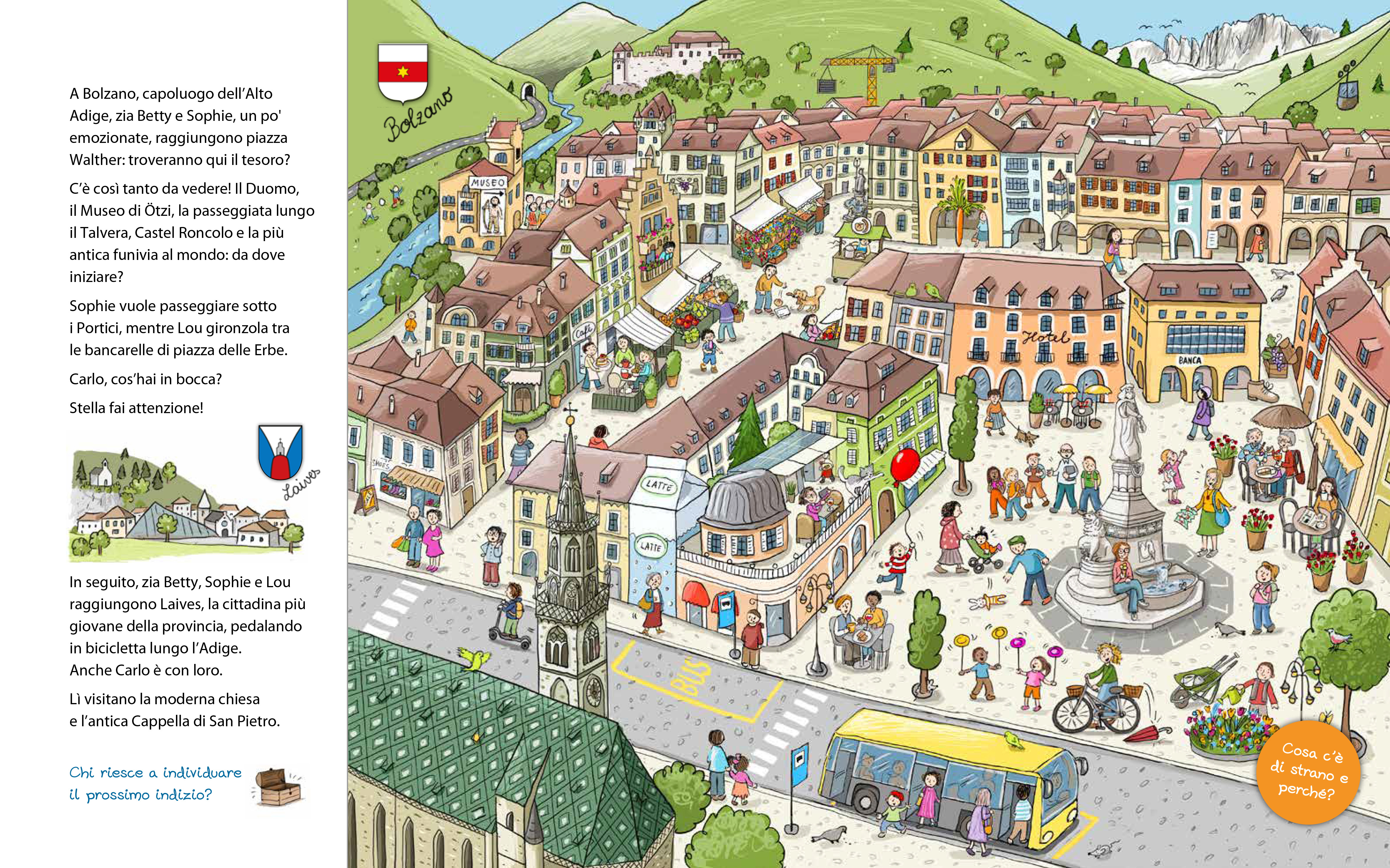 Questo libro illustrato accompagna zia Betty, Sophie e Lou attraverso le più belle città dell'Alto Adige. Da Glorenza a Bolzano, passando per Merano, Chiusa, Bressanone, Vipiteno e Brunico, le protagoniste vivono avventure divertenti e fantasiose, assistendo a scene singolari, fonte di stupore e divertimento, come quella di un coccodrillo seduto al tavolino di un bar. Ogni doppia pagina racconta una nuova storia, ponendo quesiti di ricerca e stimolando la fantasia. Un volume spassoso, che assicura scoperte creative per tutta la famiglia.