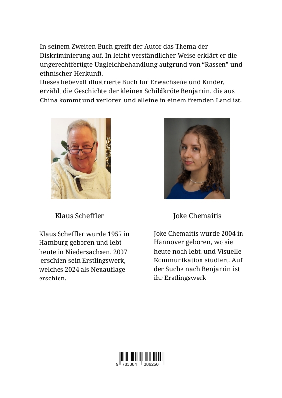In seinem Zweiten Buch greift der Autor das Thema der Diskriminierung auf. Dieses liebevoll illustrierte Buch erzählt die Geschichte der kleinen Schildkröte Benjamin, die aus China kommt und verloren und alleine in einem fremden Land ist. In der kleinen Raupe Roland und dem Raben Krax findet die Schildkröte Freunde, die ihr helfen, Feindschaft in Freundschaft zu wandeln.