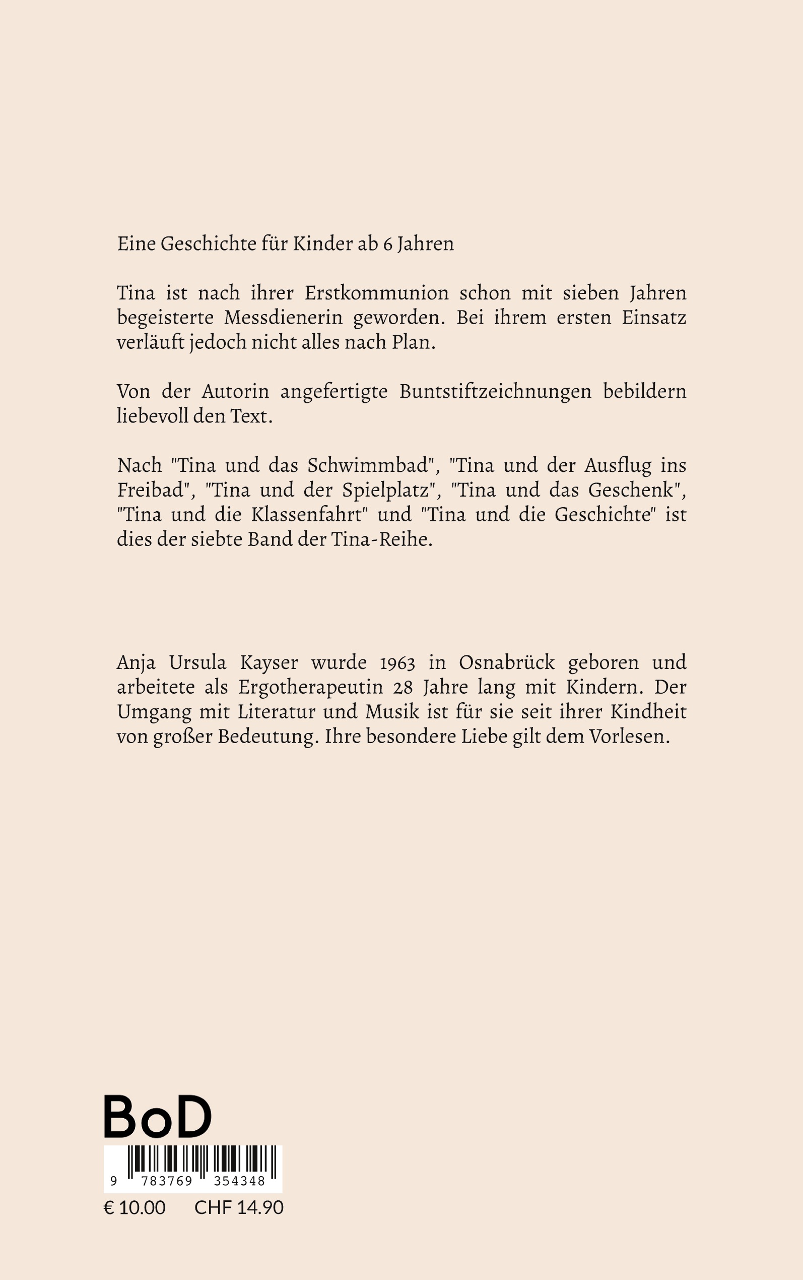 Anja Ursula Kayser wurde 1963 in Osnabrück geboren. Nach ihrem Abitur absolvierte sie eine Ausbildung zur Ergotherapeutin und arbeitete in unterschiedlichen Einrichtungen 28 Jahre lang mit Kindern im Kindergarten- und Grundschulalter. Gemeinsam mit ihrem Mann verfasste sie das Fachbuch "Spiel, Spielen, Therapie" und verschiedene Fachartikel zum gleichen Thema. Ihre Liebe zur Literatur besteht schon seit ihrer Kindheit und findet Ausdruck nicht nur im Lesen sondern auch im Vorlesen von Büchern. In diesem Zusammenhang entstand dieses Buch, das sie liebevoll mit eigenen Buntstiftzeichnungen bebildert hat. Nach "Tina und das Schwimmbad", "Tina und der Ausflug ins Freibad", "Tina und der Spielplatz", "Tina und das Geschenk", "Tina und die Klassenfahrt" und "Tina und die Geschichte" ist dies der siebte Band der Tina-Reihe.