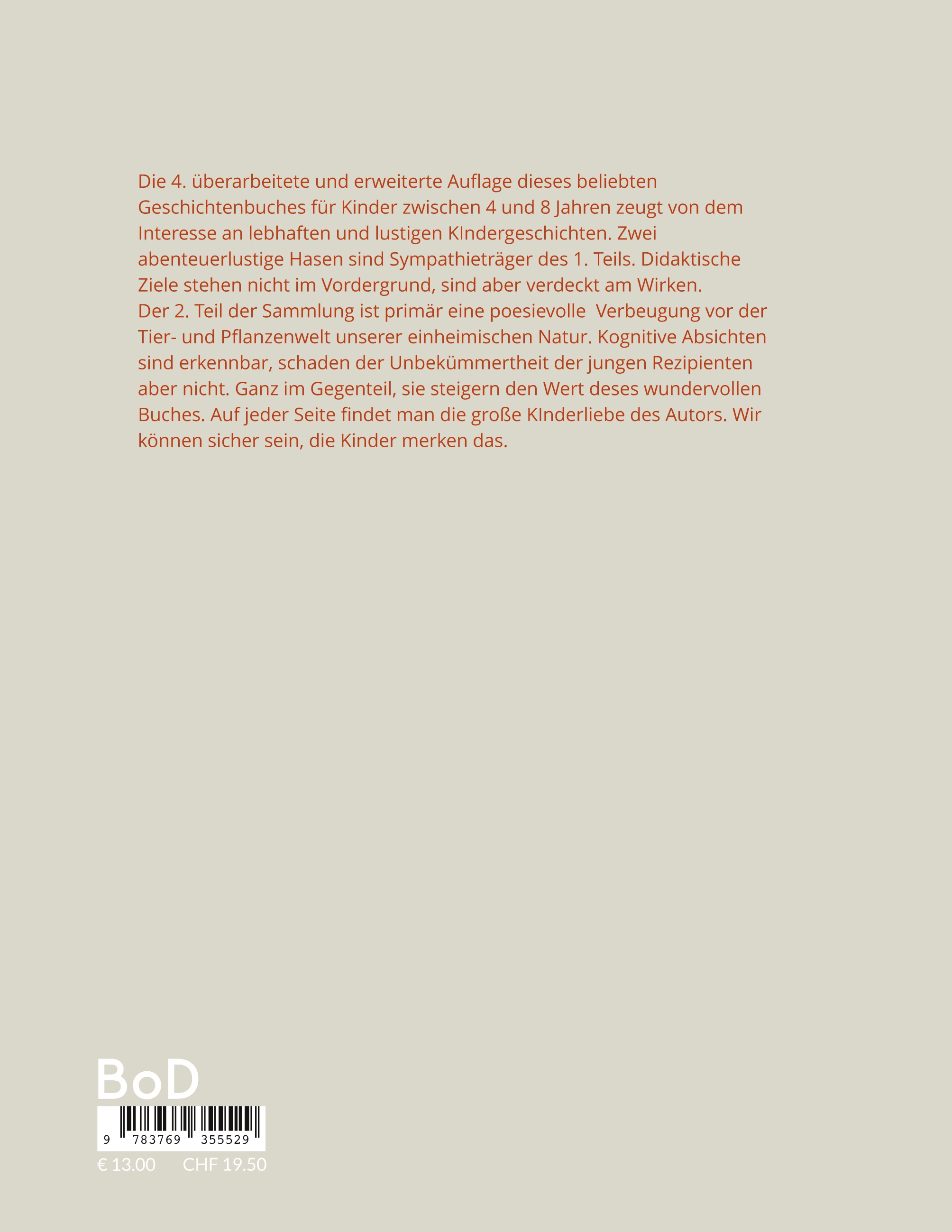 Die 4. überarbeitete und erweiterte Auflage dieses beliebten Geschichtenbuches für Kinder zwischen 4 und 8 Jahren zeugt von dem Interesse an lebhaften und lustigen KIndergeschichten. Zwei abenteuerlustige Hasen sind Sympathieträger des 1. Teils. didaktische Ziele stehen nicht im Vordergrund, sind aber verdeckt am Wirken.