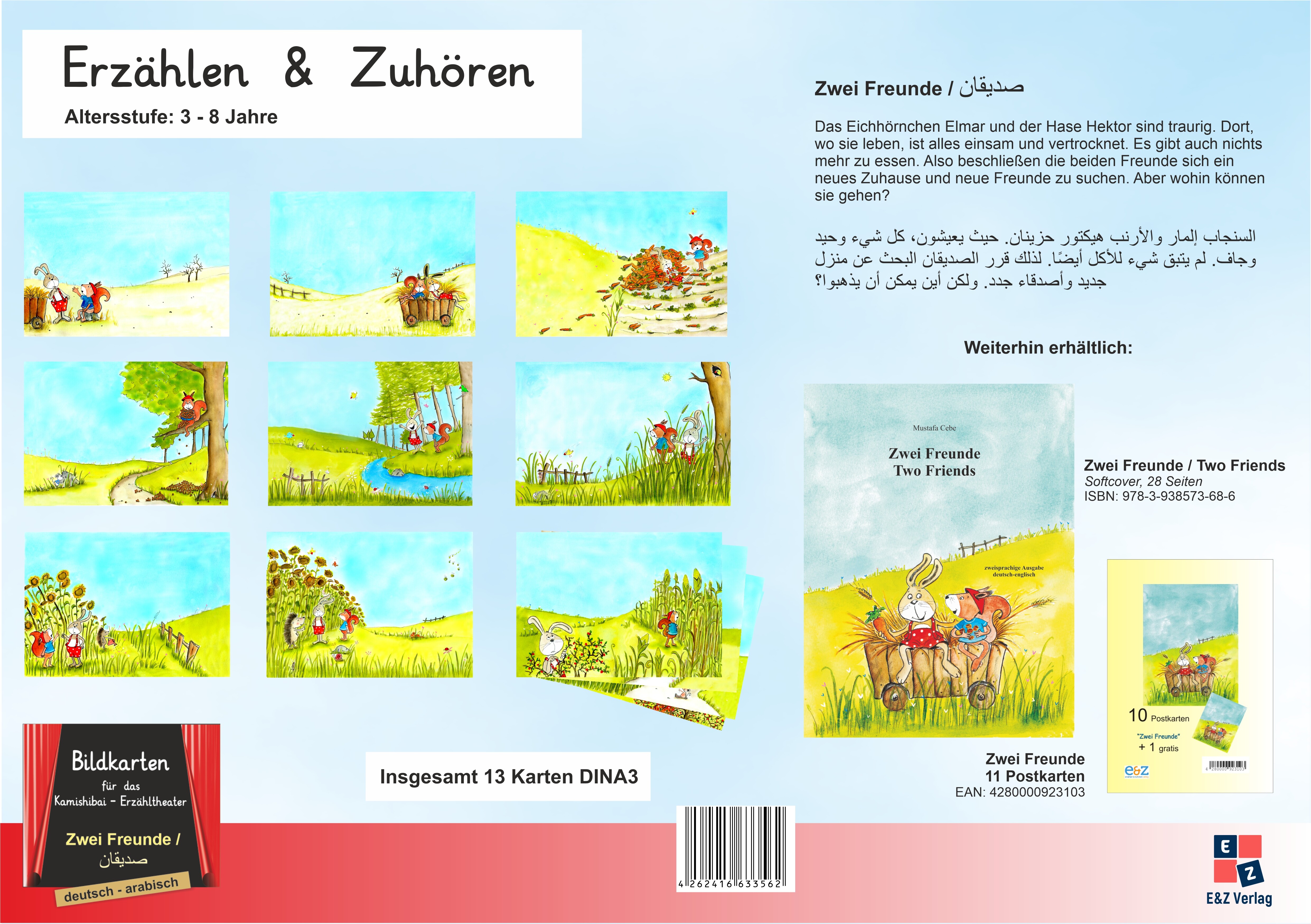 Zweisprachige Bildkarten der Bilderbuchgeschichte "Zwei Freunde" in deutsch - kroatisch- 13 Bildkarten im DINA3 - Format (29,7 x 42,0 cm), auf festem 300g-Bilderdruck- farbig illustriert- passend für das Kamishibai-Theater- in praktischer DINA3-Tasche zur Aufbewahrung- ideal zur Sprachförderung- kompletter Text auf separater Seite zum Vorlesen in deutsch und kroatisch- ideale Ergänzung zum KniebuchDie Bildkarten eignen sich mit ihrem spielerischen Ansatz und der Verbindung vom Zuhören und Sehen perfekt für die Sprachförderung in der Kita oder zum Zweitspracherwerb.. Die Bildkarten werden in das Kamishibai gesteckt und beim Vorlesen des Textes ausgewechselt. Danach können sie auch im Gruppenzimmer aufgehängt werden, um weitere Aktionen zu gestalten.Thema Streit:Das Eichhörnchen Elmar und der Hase Hektor sind traurig. Dort, wo sie leben, ist alles einsam und vertrocknet. Es gibt auch nichts mehr zu essen. Also beschließen die beiden Freunde sich ein neues Zuhause und neue Freunde zu suchen. Aber wohin können sie gehen?NEU - Jetzt auch als KNIEBUCH erhältlich!Alle Kamishibais und Kniebücher sind in 27 verschiedenen Sprachen erhältlich: