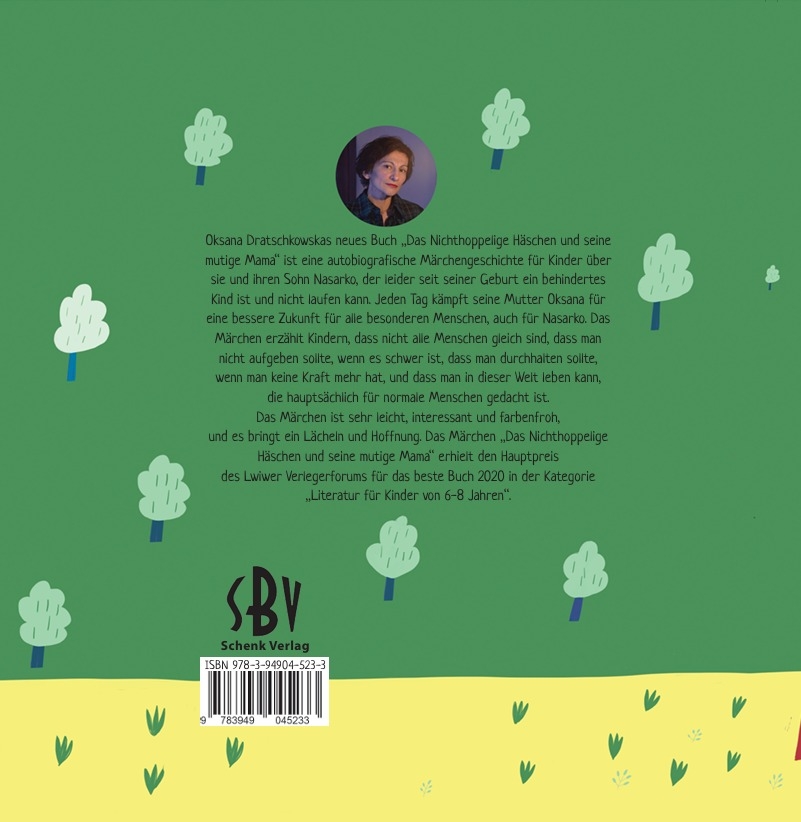 Oksana Dratschkowskas neues Buch Das Nichthoppelige Häschen und seine mutige Mama ist eine autobiografische Märchengeschichte für Kinder über sie und ihren Sohn Nasarko, der leider seit seiner Geburt ein behindertes Kind ist und nicht laufen kann. Jeden Tag kämpft seine Mutter Oksana für eine bessere Zukunft für alle besonderen Menschen, auch für Nasarko. Das Märchen erzählt Kindern, dass nicht alle Menschen gleich sind, dass man nicht aufgeben sollte, wenn es schwer ist, dass man durchhalten sollte, wenn man keine Kraft mehr hat, und dass man in dieser Welt leben kann, die hauptsächlich für normale Menschen gedacht ist. Das Märchen ist sehr leicht, interessant und farbenfroh, und es bringt ein Lächeln und Hoffnung. Das Märchen "Das Nichthoppelige Häschen und seine mutige Mama" erhielt den Hauptpreis des Lwiwer Verlegerforums für das beste Buch 2020 in der Kategorie "Literatur für Kinder von 6-8 Jahren"