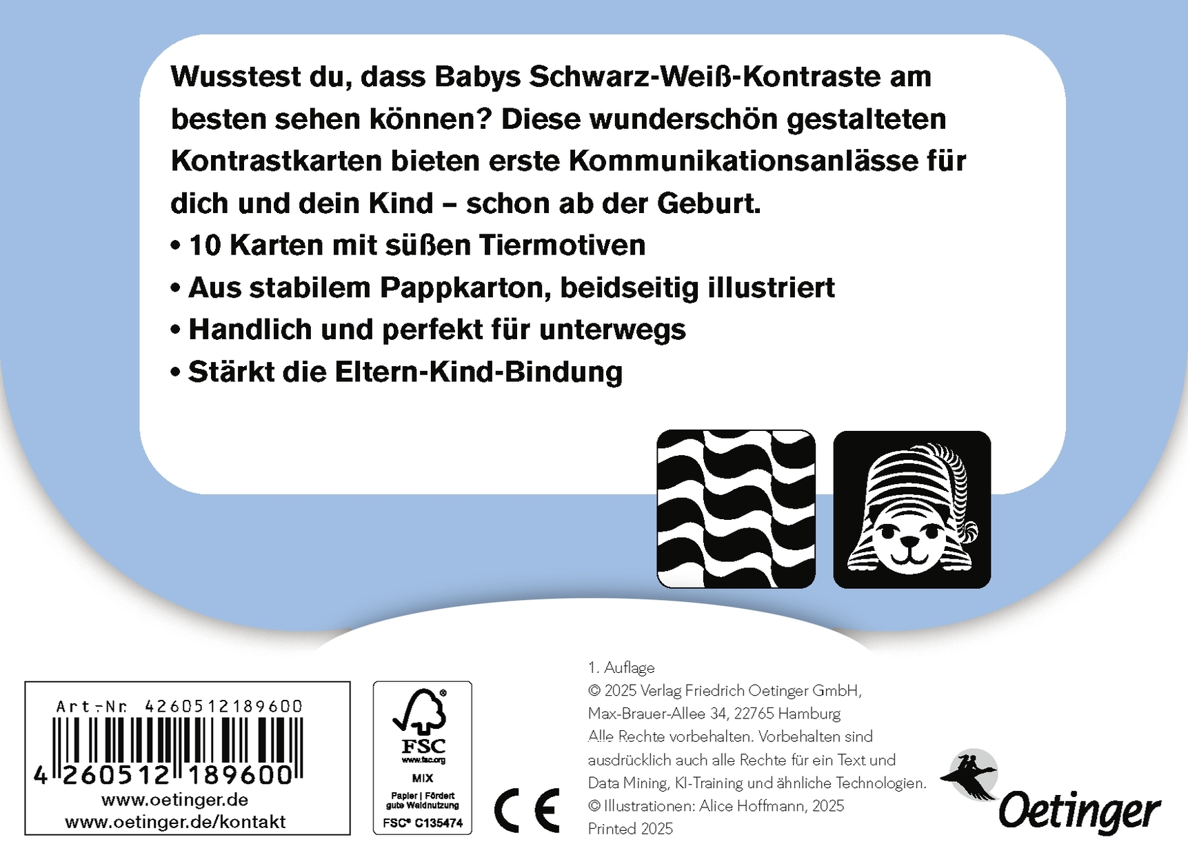 | Schlagworte | Babys • Beschäftigung • Eltern-Kind-Bindung • Erste Bücher • Geschenke zur Geburt • Kontrastbilder Baby • Kontrast Spielzeug Baby • Säuglinge • schwarz-weiß Karten Baby • Sehen lernen |