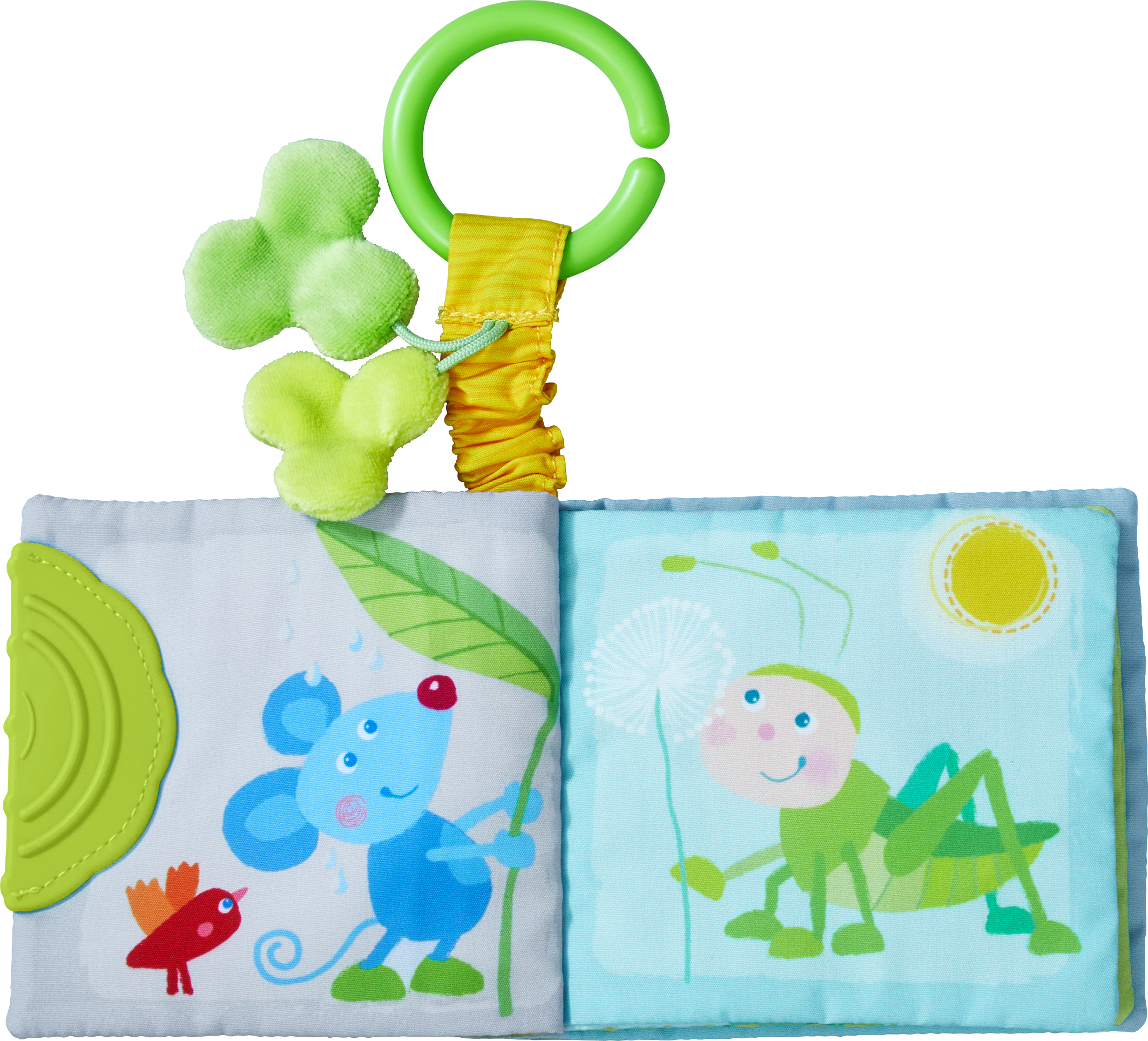 Ein sommerlicher Ausflug auf die Blumenwiese ist das Buggybuch Wiesentiere von HABA. Das Stoffbuch für Babys ab 6 Monaten begeistert mit farbenfrohen Tierbildern, Quietsche und Knisterfolie. Kleine Kinderhände können die Seiten gut greifen und umblättern. Dabei trainieren Babys ihre Handmotorik. Die akustischen Effekte und die liebevollen Illustrationen regen die Wahrnehmung kleiner Weltentdecker an. Babys erkunden die Welt auch mit dem Mund, daher hat das Buggybuch ein Beißelement. Das massiert prima das Zahnfleisch und hilft beim Zahnen. Mit dem robusten Kunststoffring lässt sich das weiche Babybuch befestigen am Spieltrapez, Bettchen und Kinderwagen. Tierisch viel Spaß zuhause und unterwegs mit HABA.