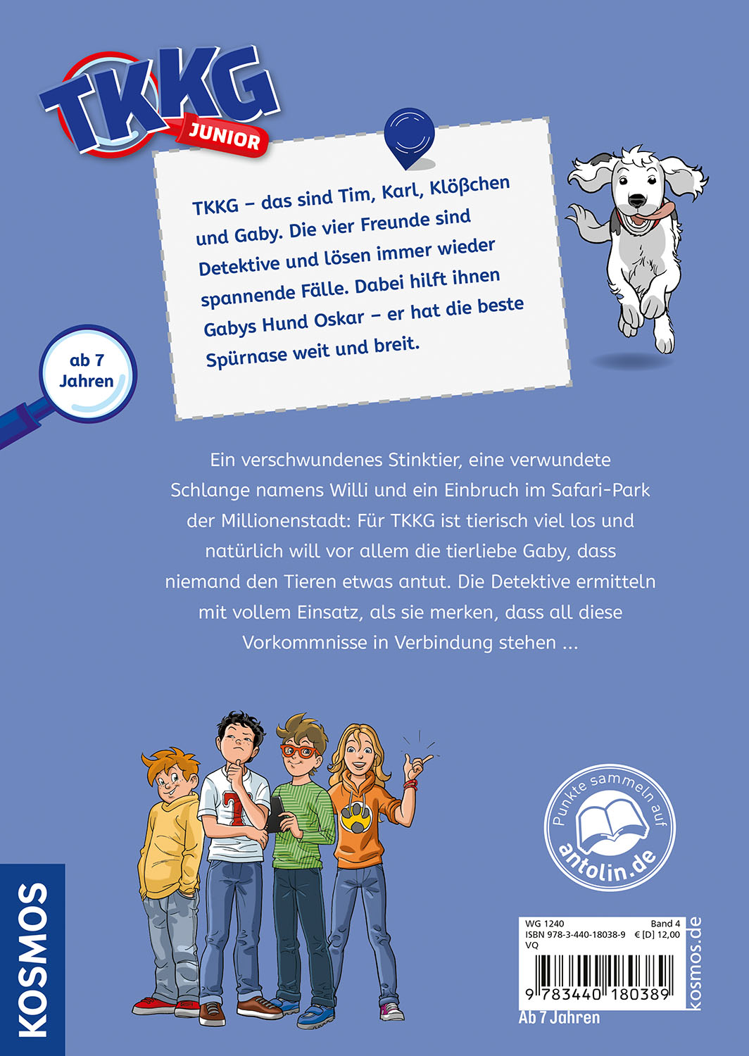 Ein Stinktier und andere exotische Tiere werden aus dem Safari-Park gestohlen. Wer steckt dahinter? Was hat der „Tier-Sammler“ vor? TKKG in einem gefährlichen Fall. Bald müssen sie wilde Tiere und sich selbst aus der Gefangenschaft retten. Ein Krimifall mit Witz, Humor und vierfarbigen Zeichnungen.