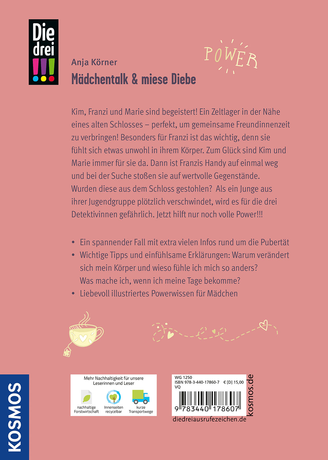 Ein spannender Krimi voller Freundschaft und Themen rund ums Erwachsenwerden! Die drei !!! erleben auf einer Zeltfreizeit mit Mädchen und Jungen verschiedener Altersstufen nicht nur einen neuen Fall, sondern stehen auch vor ganz persönlichen Herausforderungen: Was tun, wenn plötzlich die erste Periode einsetzt? Warum verändert sich die Haut – und woher kommen diese Stimmungsschwankungen? Mit hilfreichen Tipps in Infokästen und liebevollen Illustrationen bietet das Buch wertvolle Unterstützung und jede Menge Lesespaß.