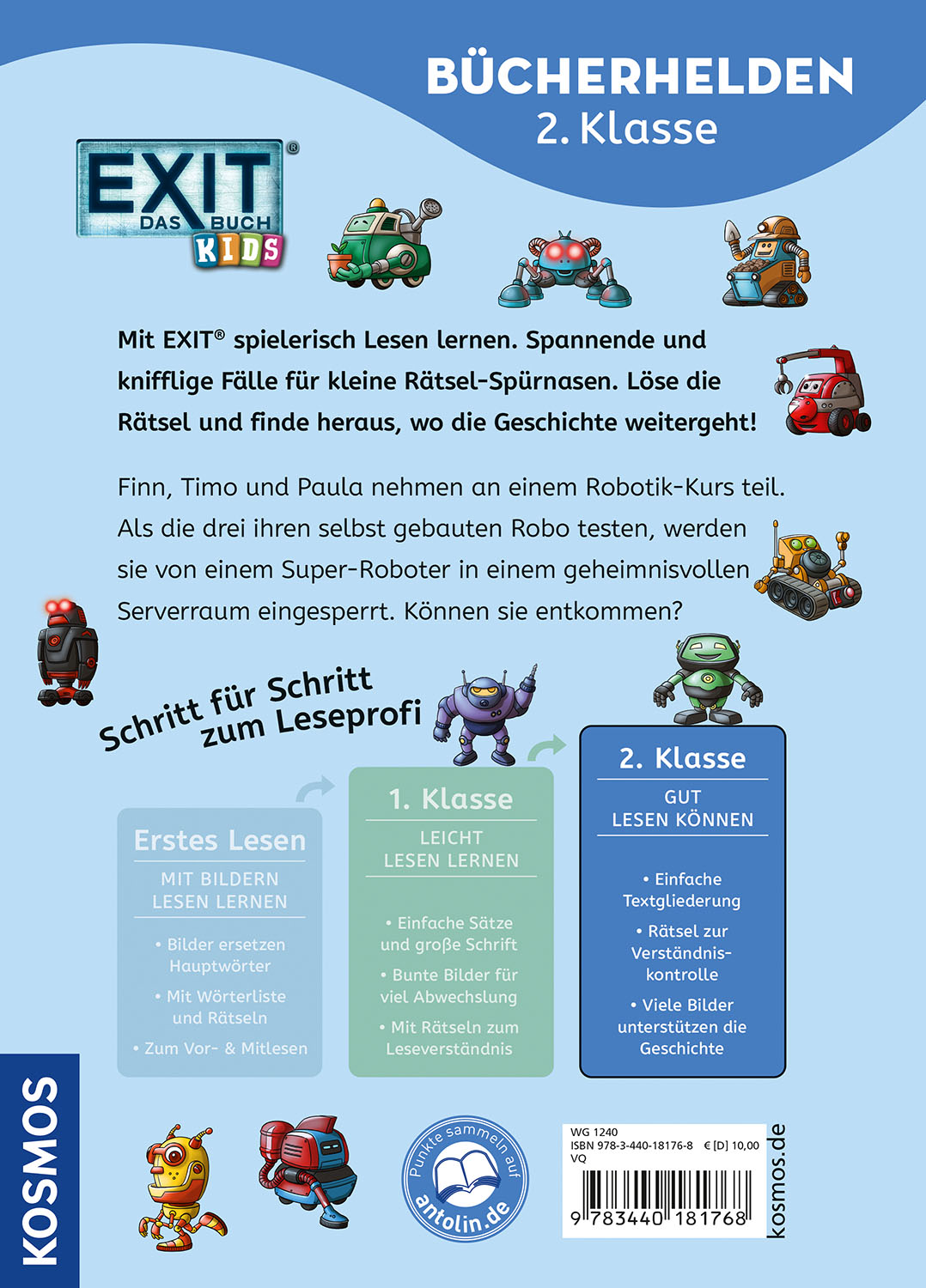 | Schlagworte | 2. Klasse • ab 7 • Abenteuer • Erstes Lesen • Erstlesebuch • Escape • Exit für Kinder • Freundschaft • Grundschule • interaktiv • Leseanfänger • Lesen lernen • Lesen üben • Rätsel • Rätsel lösen • Roboter • Schulanfänger |