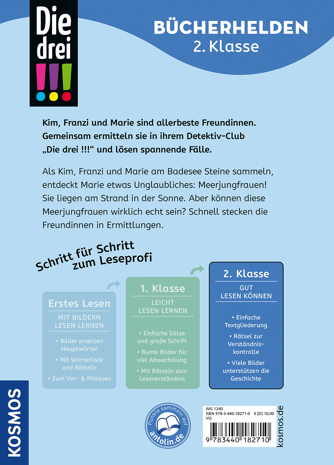 Kim, Franzi und Marie sammeln Steine am Badesee. Dort entdecken sie Meerjungfrauen am Strand. Sind sie echt? Ein spannender Fall in acht Kapiteln. Mit einfacher Schrift, vielen vierfarbigen Bildern und Rätseln zum Leseverständnis. Die drei !!! in der Reihe Bücherhelden – ab der zweiten Klasse.