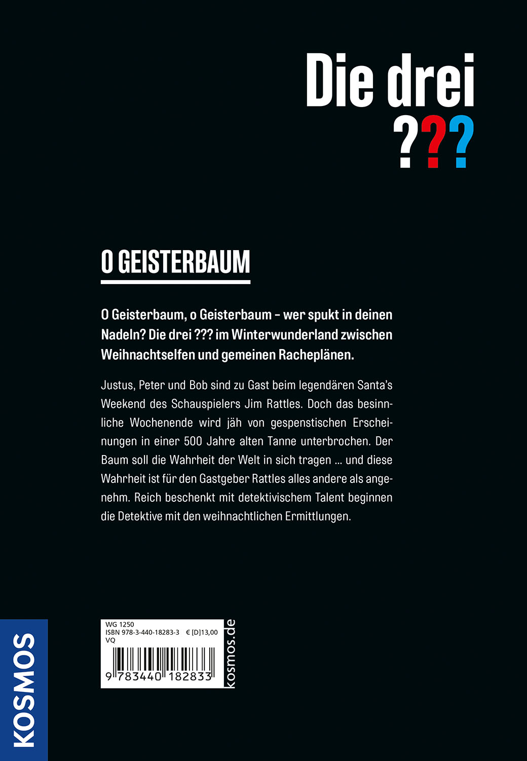 Ein neuer Kriminalfall für die beliebten Detektive aus Rocky Beach. Justus, Peter und Bob werden zum berühmten „Santa´s Weekend“ bei Schauspieler Jim Rattle eingeladen. Ein Wochenende im Schnee – was gibt es Schöneres? Doch dann kommt es zu ungewöhnlichen Vorfällen. Vor der Villa, in der die Feier stattfinden wird, steht der berühmte Geisterbaum. Viele Legenden ranken sich um die 500 Jahre alte Tanne. Stimmt es, dass im Baum Gespenster hausen? Die Detektive glauben eigentlich nicht an Spuk. Als die Gäste von einem Geist überrascht werden, haben auch die Detektive erst einmal Zweifel. Ein actionreicher Krimifall im Advent wartet auf Justus, Peter und Bob.
