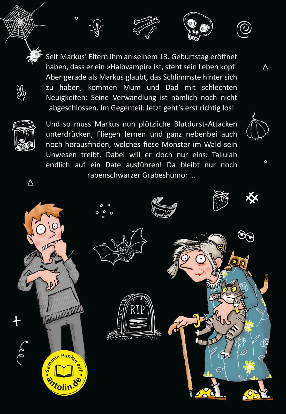 Und so muss Markus plötzlich auftretende Blutdurstattacken unterdrücken, Fliegen lernen und ganz nebenbei auch noch herausfinden, welches blutrünstige Monster im Wald sein Unwesen treibt. Dabei will er doch nur eins: Endlich Tallulah auf ein Date ausführen! Da bleibt nur noch rabenschwarzer Grabeshumor ...