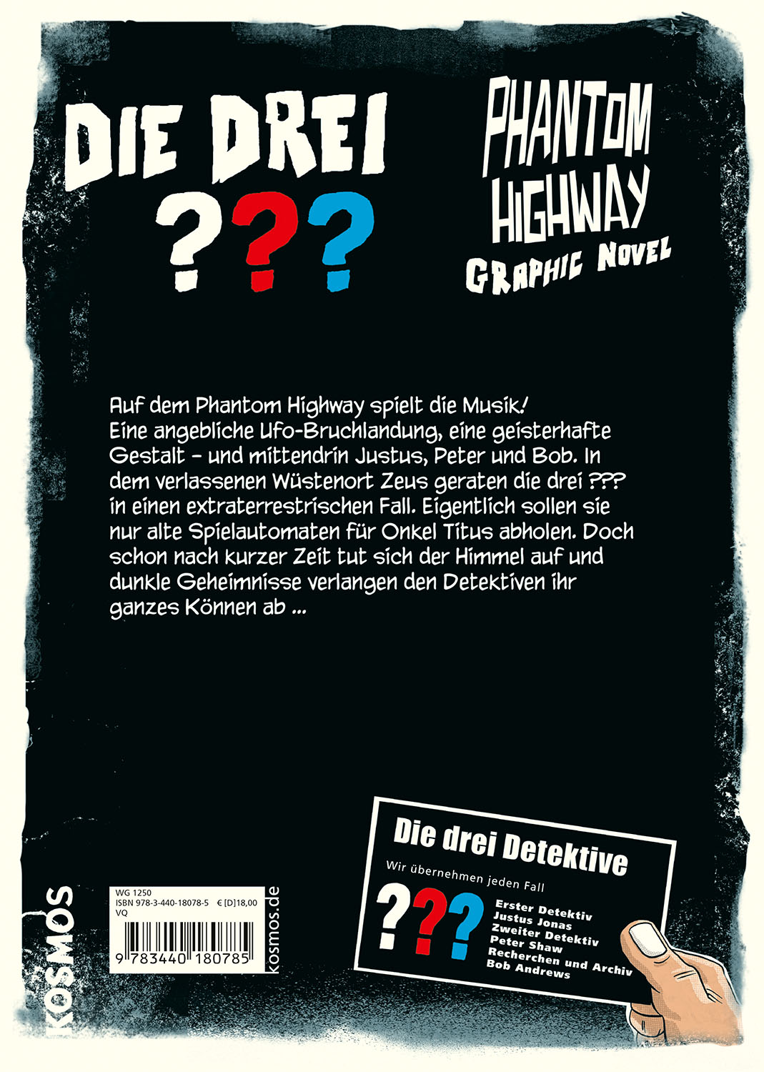 Ein neuer Krimifall für die drei beliebten Detektive aus Rocky Beach! Justus, Peter und Bob geraten auf dem Phantom Highway in ein mysteriöses Abenteuer. Eigentlich wollen sie nur für Onkel Titus alte Spielautomaten abholen, doch in dem verlassenen Wüstenort Zeus geraten sie in einen extraterrestrischen Fall. Schon bald merken sie, dass hier etwas nicht mit rechten Dingen zugeht. Dunkle Geheimnisse und unerklärliche Begegnungen stellen den Mut und den Verstand der drei Detektive auf die Probe. Ein packender Fall im coolen Graphic-Novel-Stil.