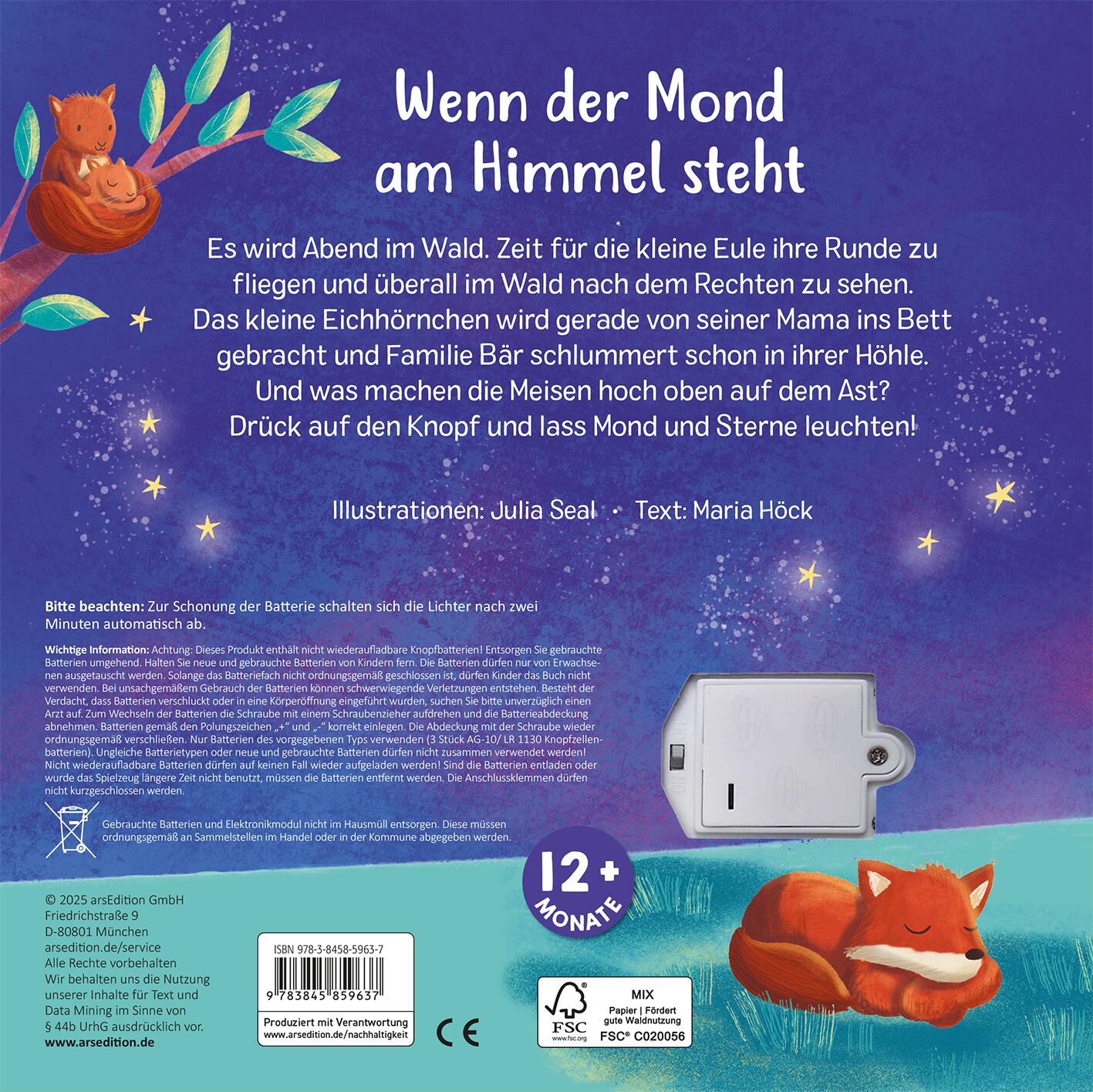 Es wird Abend im Wald. Leise geht der Mond am Himmel auf und die Sterne beginnen zu leuchten. Die kleine Eule fliegt los und dreht ihre abendliche Runde durch den friedlichen Wald, um überall nach dem Rechten zu sehen. Das kleine Eichhörnchen wird gerade von seiner Mama ins Bett gebracht und Familie Bär schlummert schon in ihrer Höhle. Und was machen die Meisen hoch oben auf dem Ast? Drück auf den Knopf und lass die Lichter leuchten!