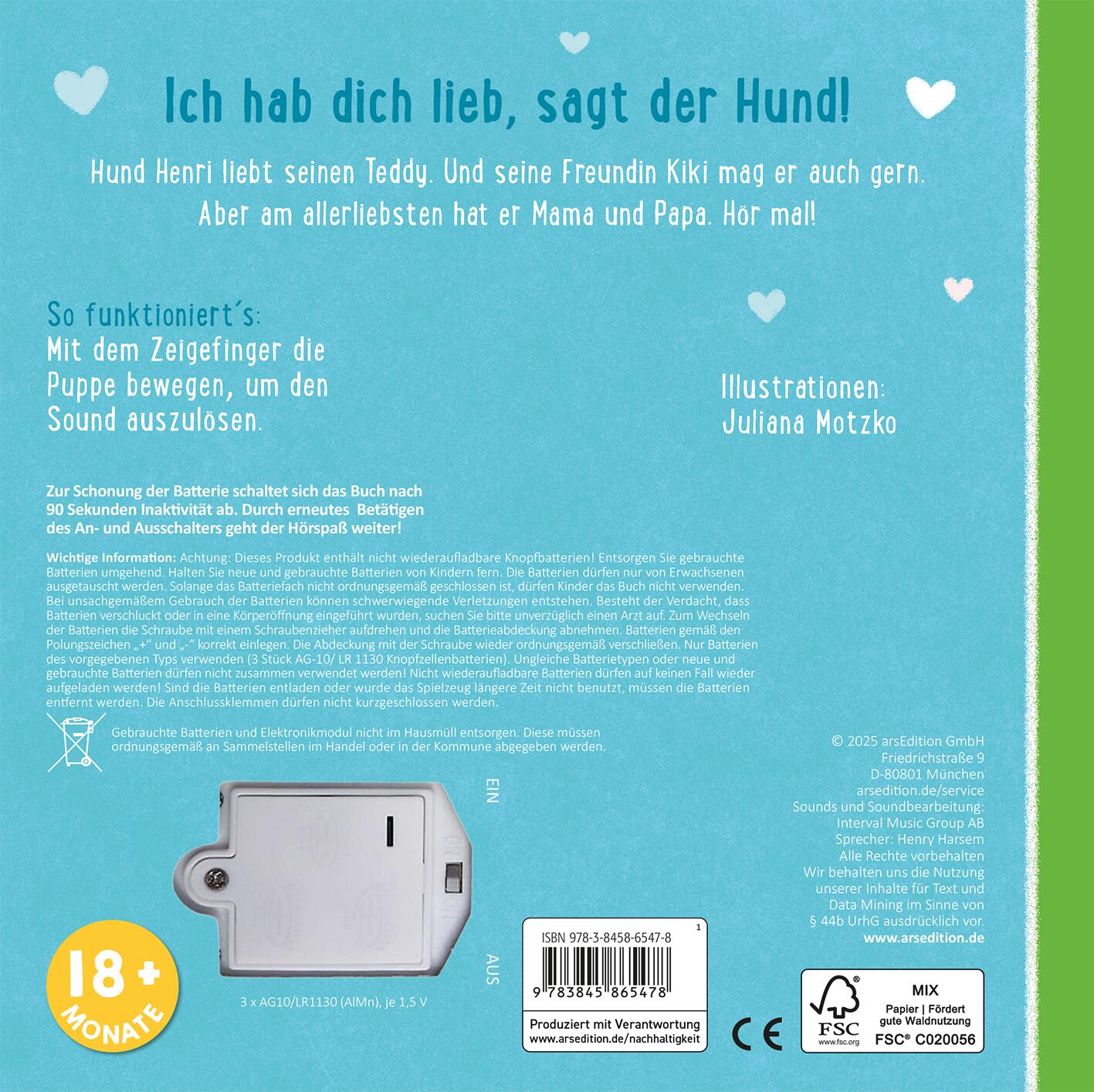 Henri, der kleine Hund, liebt seinen Teddy. Der bekommt immer einen dicken Kuss! Und er liebt Papa und Mama, weil die immer für ihn da sind. Und Oma und Opa liebt er auch, denn die haben immer Zeit. Auch seine Freundin Kiki mag er gerne und die Nachbarin von nebenan. Und wen hat er noch lieb? Hör doch mal!