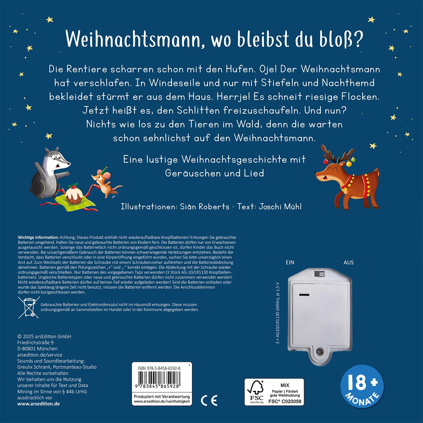 In diesem kunterbunten Pappbilderbuch wird eine lustige Geschichte rund um den Weihnachtsmann erzählt, der fast das Weihnachtfest verschläft. Die perfekte Kombination aus witzig gereimter Geschichte, abwechslungsreichen Sounds und einem tollen Weihnachtslied. Beim Drücken auf die Soundpunkte werden insgesamt fünf Geräusche ausgelöst. Den Abschluss bildet ein Gutenachtlied zum Anhören, Mitsingen und Träumen. So werden die Adventszeit und Heilig Abend für jedes Kind zu einem absoluten Highlight! Das liebevoll gestaltete Soundbuch eignet sich für Kleinkinder ab 18 Monaten.