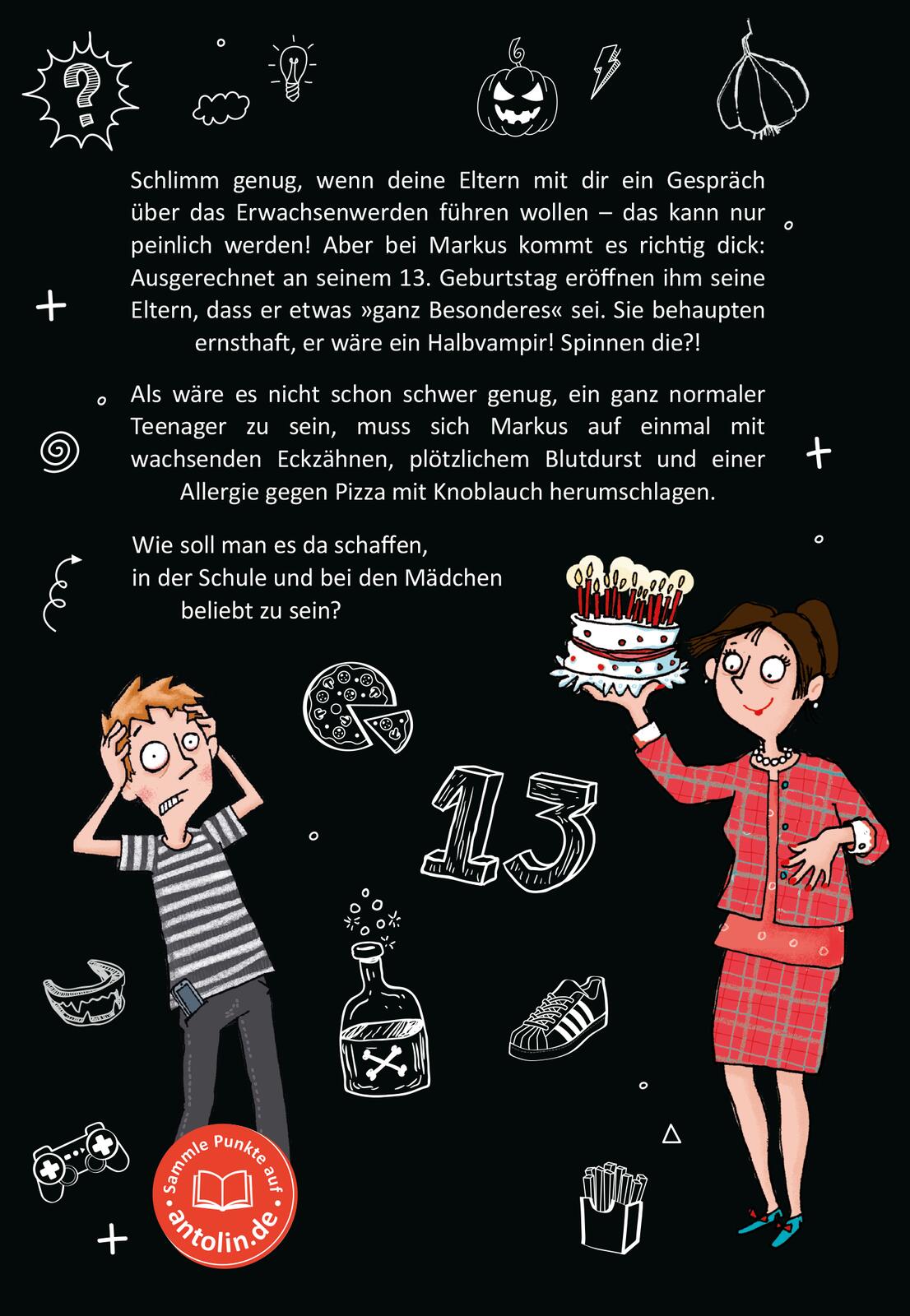 Aber bei Markus kommt es richtig dick: Ausgerechnet an seinem 13. Geburtstag eröffnen ihm seine Eltern, dass er etwas "ganz Besonderes" ist. Sie behaupten ernsthaft, er sei ein Halbvampir! Als wäre es nicht schon schwierig genug, ein ganz normaler Teenager zu sein, muss sich Markus jetzt mit wachsenden Eckzähnen, plötzlichem Blutdurst und einer Allergie gegen Pizza mit Knoblauch herumschlagen. Wie soll man es da schaffen, in der Schule und bei den Mädchen beliebt zu sein?