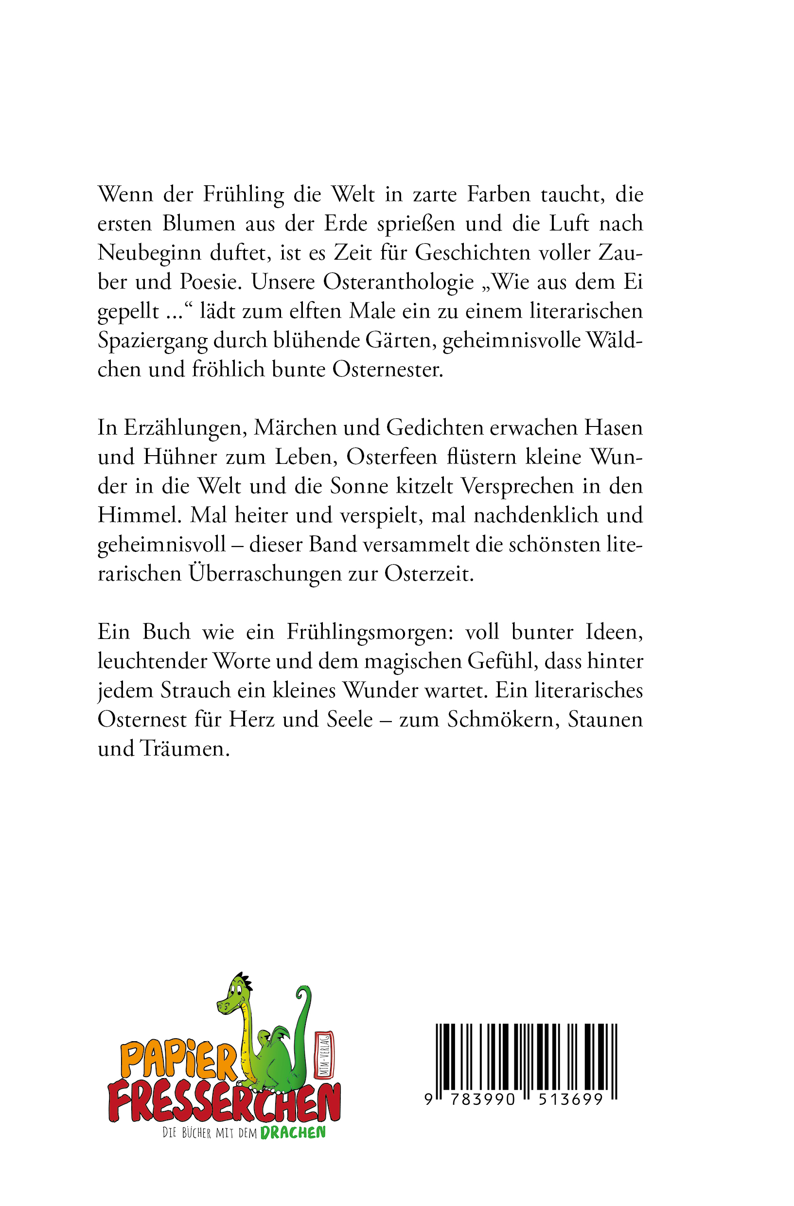 Wenn der Frühling die Welt in zarte Farben taucht, die ersten Blumen aus der Erde sprießen und die Luft nach Neubeginn duftet, ist es Zeit für Geschichten voller Zauber und Poesie. Unsere Osteranthologie „Wie aus dem Ei gepellt ...“ lädt zum elften Male ein zu einem literarischen Spaziergang durch blühende Gärten, geheimnisvolle Wäldchen und fröhlich bunte Osternester.