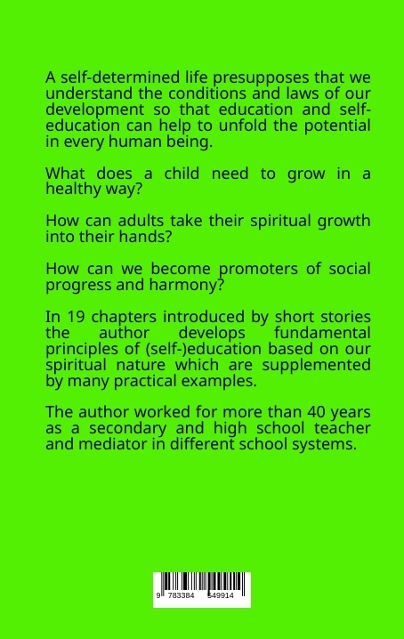 The book deals with education and self-education. Only if we understand the laws governing our (spiritual) development, we can consciously influence it.This also helps us to accompany the growth of our children with understanding and to support them to unfold their unique potential and to play a constructive rolein society. The spiritual principles which we find progressively revealed in all world religions and philosophical systems can also guide us to lead a more harmonious and fulfilling life. In 19 chapters introduced by short stories the author tries to introduce the most basic principles of spiritual growth along with many practical suggestions.