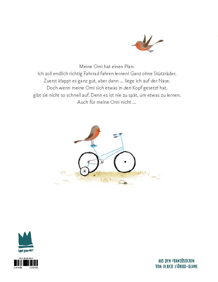 Omi hat beschlossen, dass ich Fahrrad fahren lernen muss. Und zwar richtig: nämlich ohne Stützräder! Gar nicht so einfach. Aber nach ein paar wackligen Versuchen und dem einen oder anderen Sturz, gelingt es mir: Das Fahrrad rollt schnurgerade vor sich hin. Omi klatscht begeistert Beifall. Und dann habe ich eine Idee: Omi muss das auch lernen! Eines Tages fahren wir beide bis ans Meer. Auf geht's, Omi, du schaffst das!