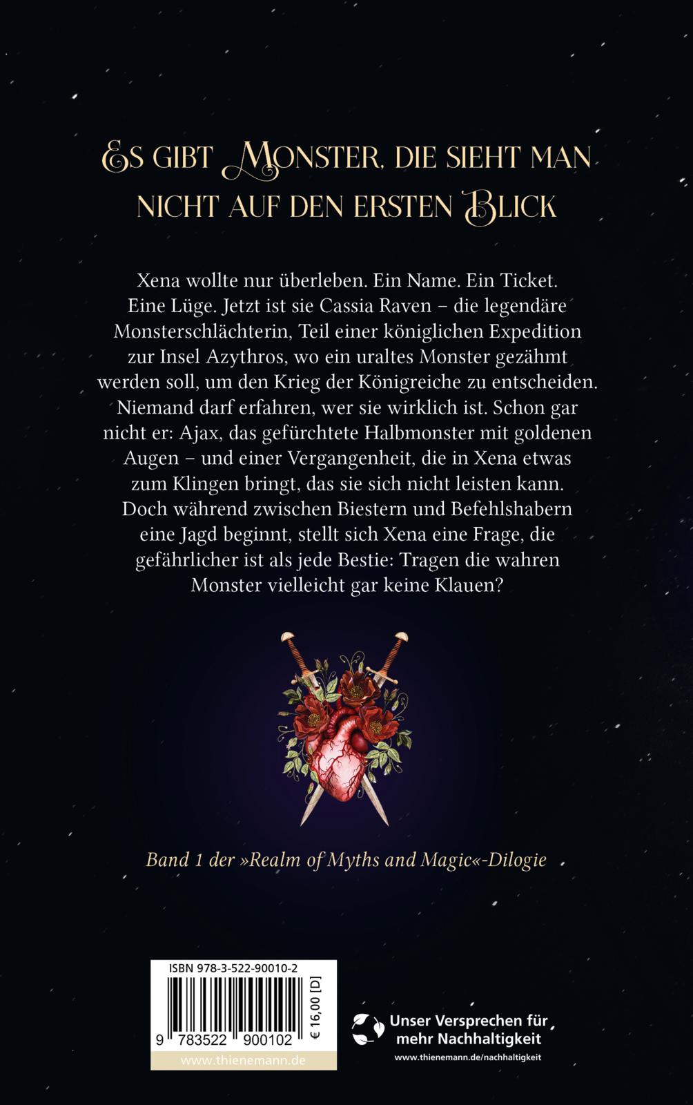 Die junge Diebin Xena wagt ein gefährliches Spiel: Als falsche Monsterjägerin schließt sie sich einer königlichen Expedition an, die auf der von Bestien beherrschten Insel Azythros eine Kreatur zähmen soll. Dabei trifft sie auf Ajax, ein Halbmonster mit düsterem Charisma und ein Instrument des Königs. Doch die wachsende Anziehung zwischen ihnen wird für Xena zur tödlichen Bedrohung - und jeder Moment könnte ihr letzter sein ...
