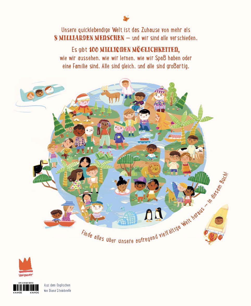100 Millionen Möglichkeiten erklärt die Schönheit und Vielfalt der Menschheit und zeigt, dass es 100 Millionen Möglichkeiten gibt, wie wir aussehen, eine Familie sind, Spaß miteinander haben und voneinander lernen. Das Buch behandelt zahlreiche Themen, die Kindern die Vielfalt der Menschheit vor Augen führen, wie zum Beispiel: wie wir lernen, wie unser Körper funktioniert, wie wir miteinander kommunizieren, wie wir umweltfreundlich leben, wie wir gute Bürger:innen sind, woran wir glauben, wie wir Feste feiern und weitere 100 Millionen Möglichkeiten, einzigartig zu sein!