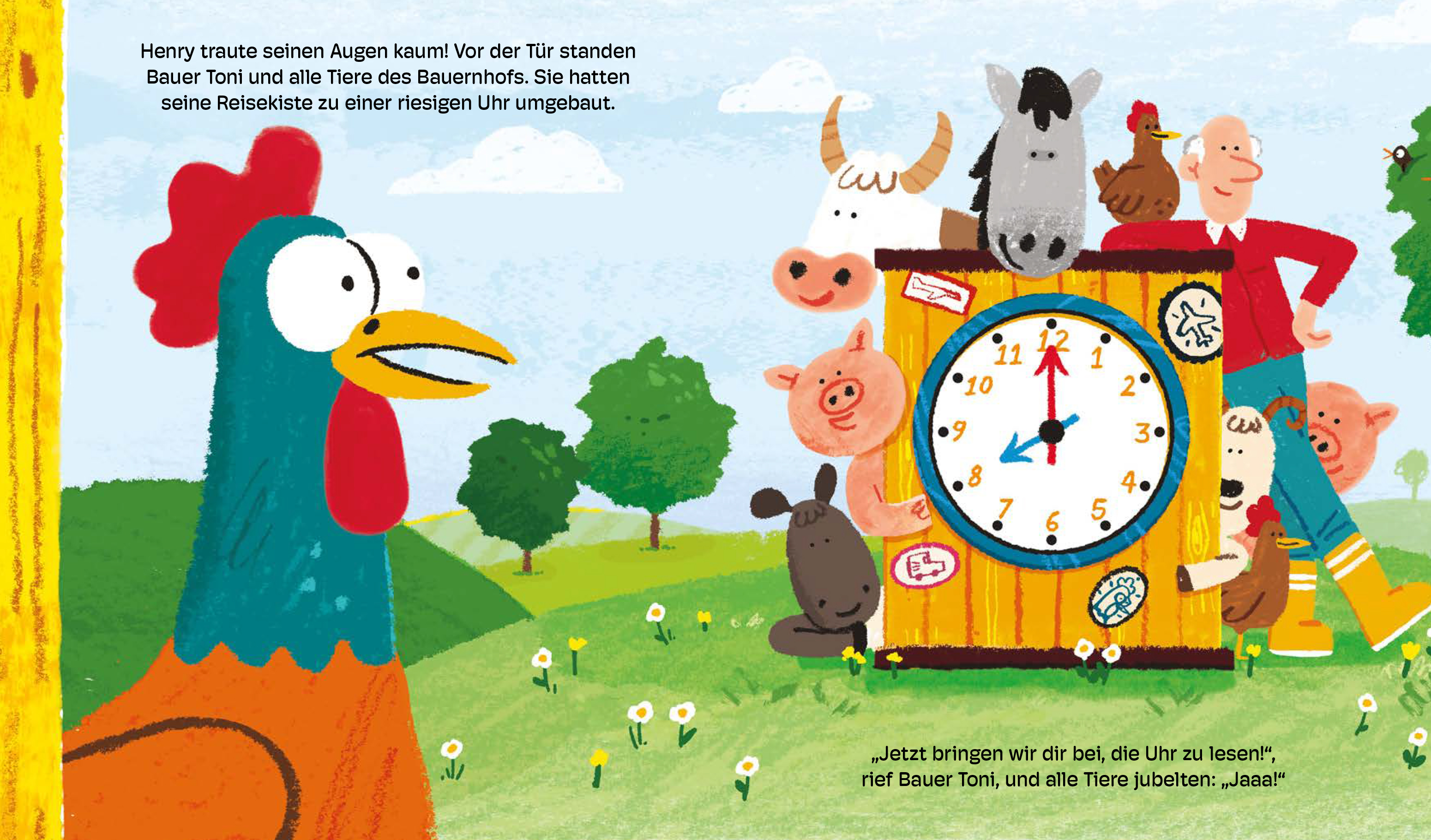 Henry Hahn kommt auf einen neuen Bauernhof! Als Hahn soll er morgens genau zur richtigen Zeit krähen, damit alle wissen, jetzt ist der Morgen da. Es gibt nur ein Problem: Henry kräht immer zur falschen Zeit! Kann er es mithilfe von Bauer Tobi und den anderen Tieren schaffen, sein Kickeriki im entscheidenden Moment zu rufen? Ein lustiges Bilderbuch, das Kindern spielerisch erklärt, die Uhrzeit zu lesen.