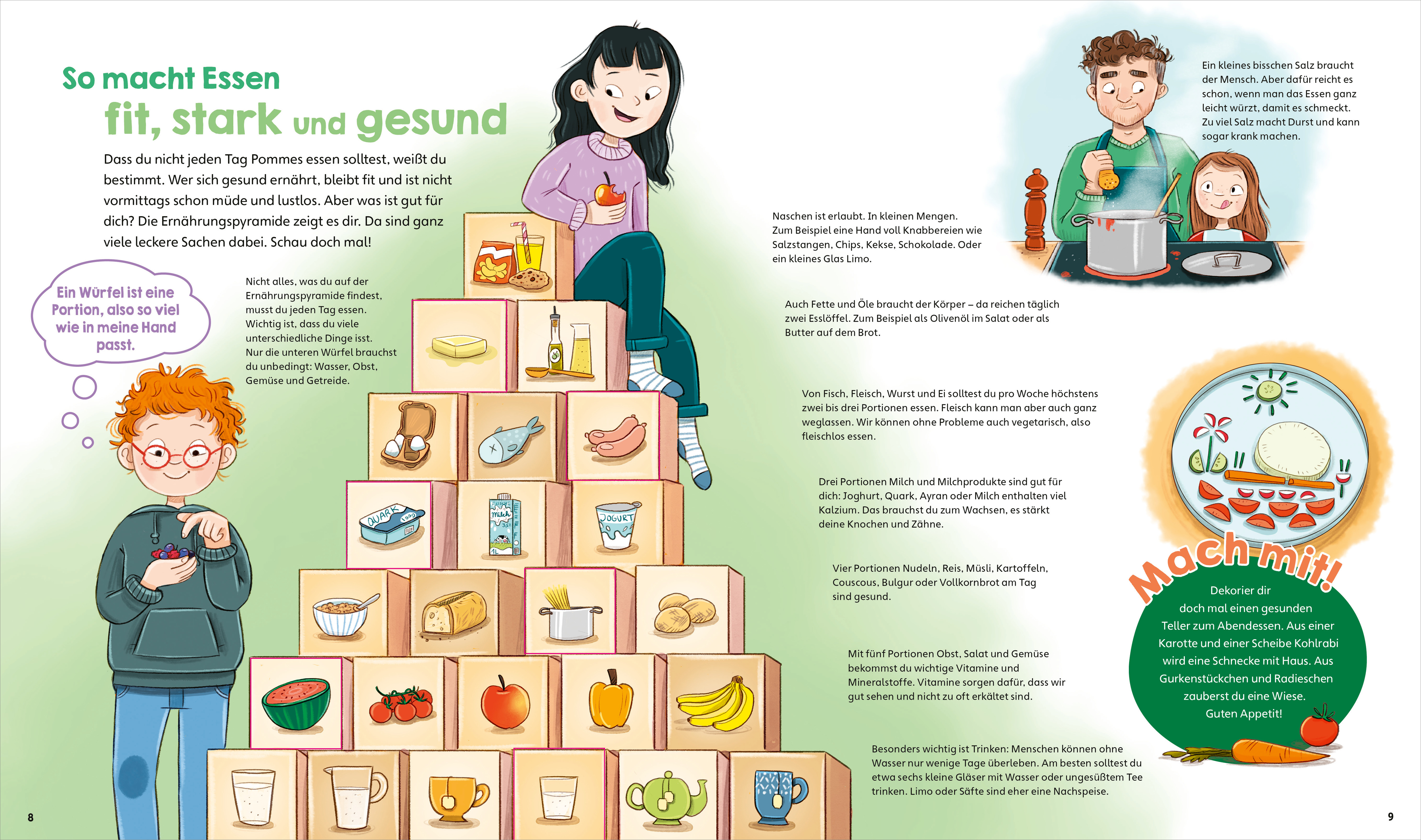 Pommes mit Ketchup oder Mayonnaise? Spaghetti Bolognese? Fischstäbchen und Kartoffelbrei? Wenn Kinder den Speiseplan festlegen würden, wären das vermutlich die Lieblingsspeisen. Aber woher kommt der Ketchup? Wie werden Fischstäbchen hergestellt und warum ist zu viel Schokolade eigentlich ungesund? Wir schauen uns unsere Lebensmittel genauer an. Woher kommen die Lebensmittel und worauf können wir beim Einkauf achten? Was macht gesundes Essen aus, wie erkennen wir es und warum ist es so wichtig? Natürlich werfen wir auch einen Blick in unseren Körper und finden heraus, was mit dem Essen passiert und welche Organe an der Verdauung beteiligt sind. Ein aufschlussreiches Sachbuch mit unterhaltsamen Klappen und ganz viel spannendem Wissen für Kinder ab 5 Jahren.