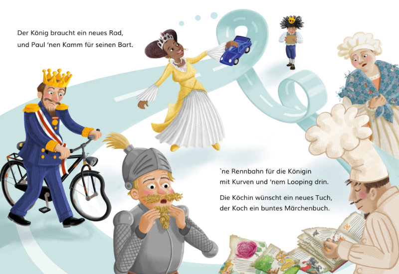 Der junge Prinz hat eine wichtige Aufgabe: Alle Wünsche für das große Fest im Schloss notieren! Von der rennbahnbegeisterten Königin bis zum märchenliebenden Koch – niemand wird vergessen. Nur die Schlossgespenster übersieht er versehentlich.