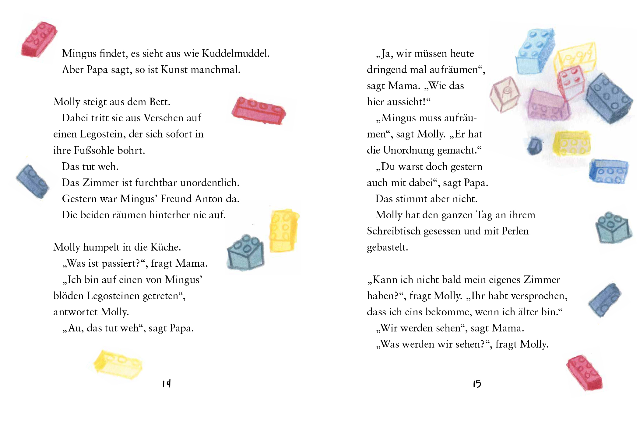 Molly reicht's! Klar hat sie ihren kleinen Bruder Mingus lieb, aber immer noch ein Zimmer mit ihm teilen zu müssen, das nervt! Wissen Mama und Papa denn nicht, wie weh es tut, wenn man ständig auf Legosteine tritt? Molly will endlich ein eigenes Zimmer - mit gelben Wänden, einem Regal für schöne Dinge und einer bunten Lichterkette. Nur: Wie kann sie ihre Eltern davon überzeugen?