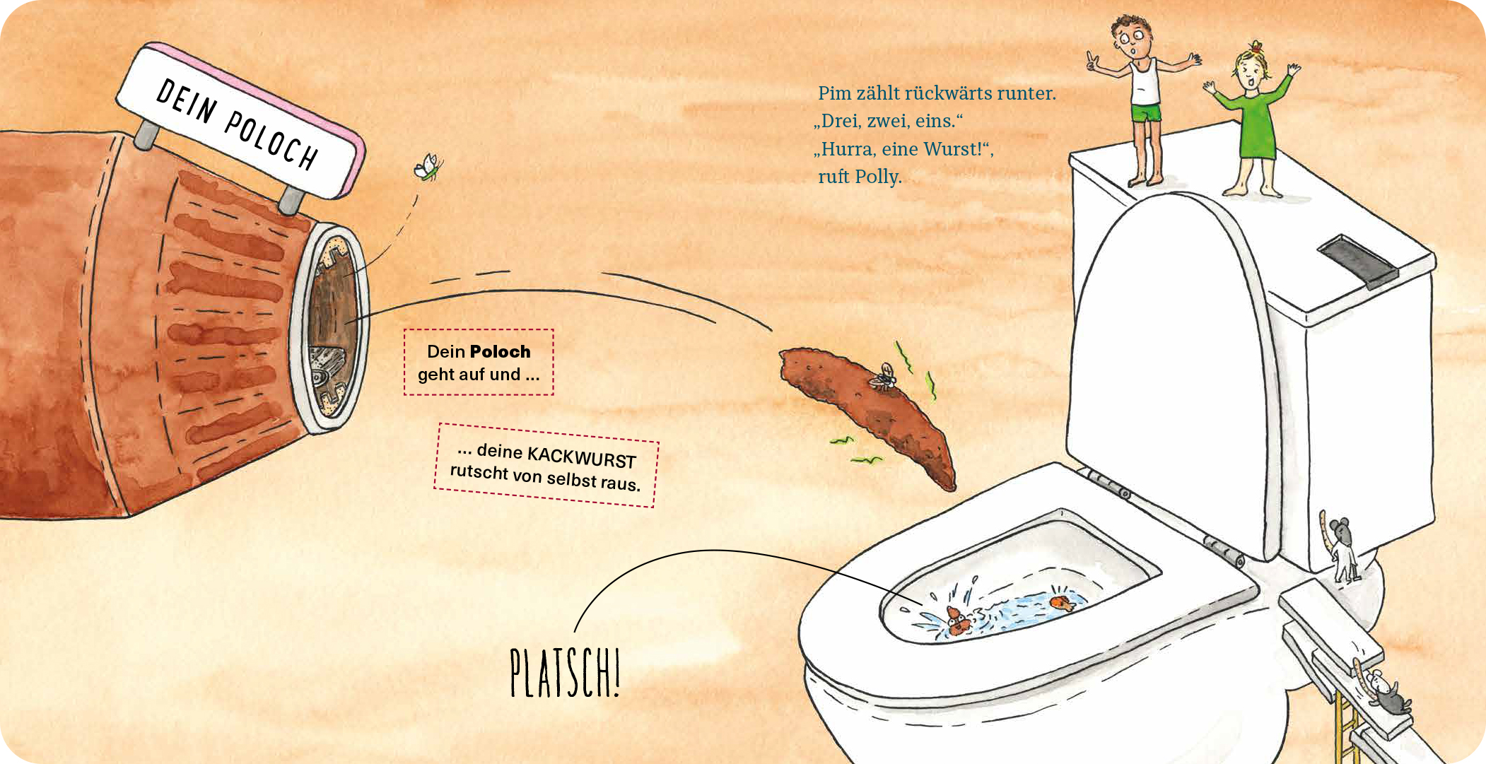 Mmh, lecker! Polly und Pim lassen sich die Banane schmecken. Aber was passiert dann mit ihr? Gemeinsam verfolgen die beiden Geschwister die spannende Verdauungsreise der Banane durch die kleine Kackwurstfabrik: vom ersten Bissen bis zur bananenförmigen Kackwurst in der Kloschüssel oder im Töpfchen.