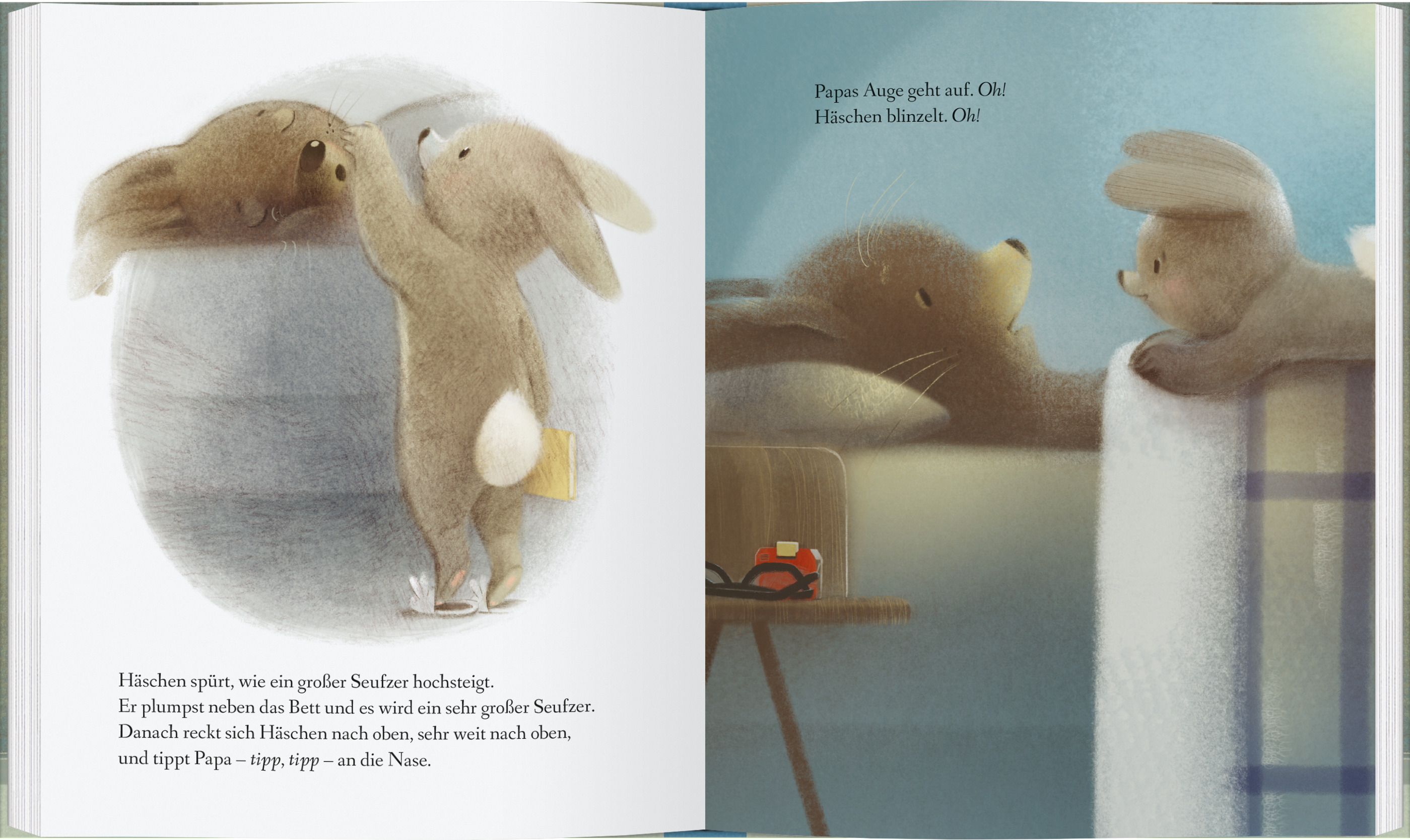 | Schlagworte | Bett • Einschlafen • Hase • Kind • Kuscheln • müde • Nacht • Papa • Wach werden • Wecken |
