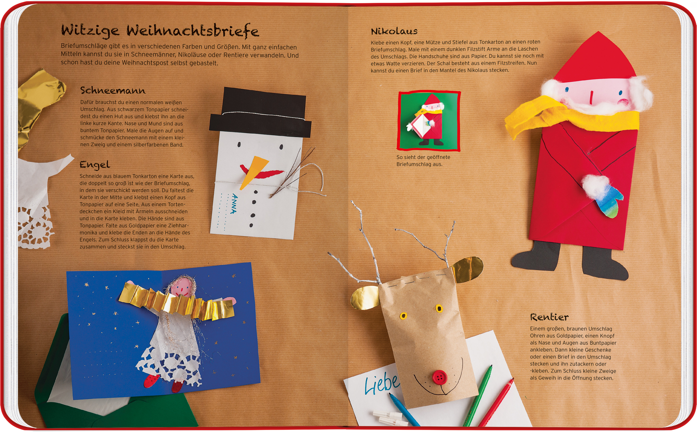 Egal ob selbst gebastelte Engel, Adventskalender oder bunte Kränze - mit Muffinförmchen, Goldpapier oder Streichholzschachteln entstehen die tollsten Weihnachtsbasteleien. Diese originellen DIY-Ideen können schon im Kindergartenalter umgesetzt werden. Sterne aus Goldfolie - Weihnachtsbaum aus Filz - Engel aus Filtertüten - Weihnachtsmann aus Stoff - grüne Kränze aus Tannenzweigen oder Schleifenband -Weihnachtspostkarten aus Karton ... und vieles mehr!