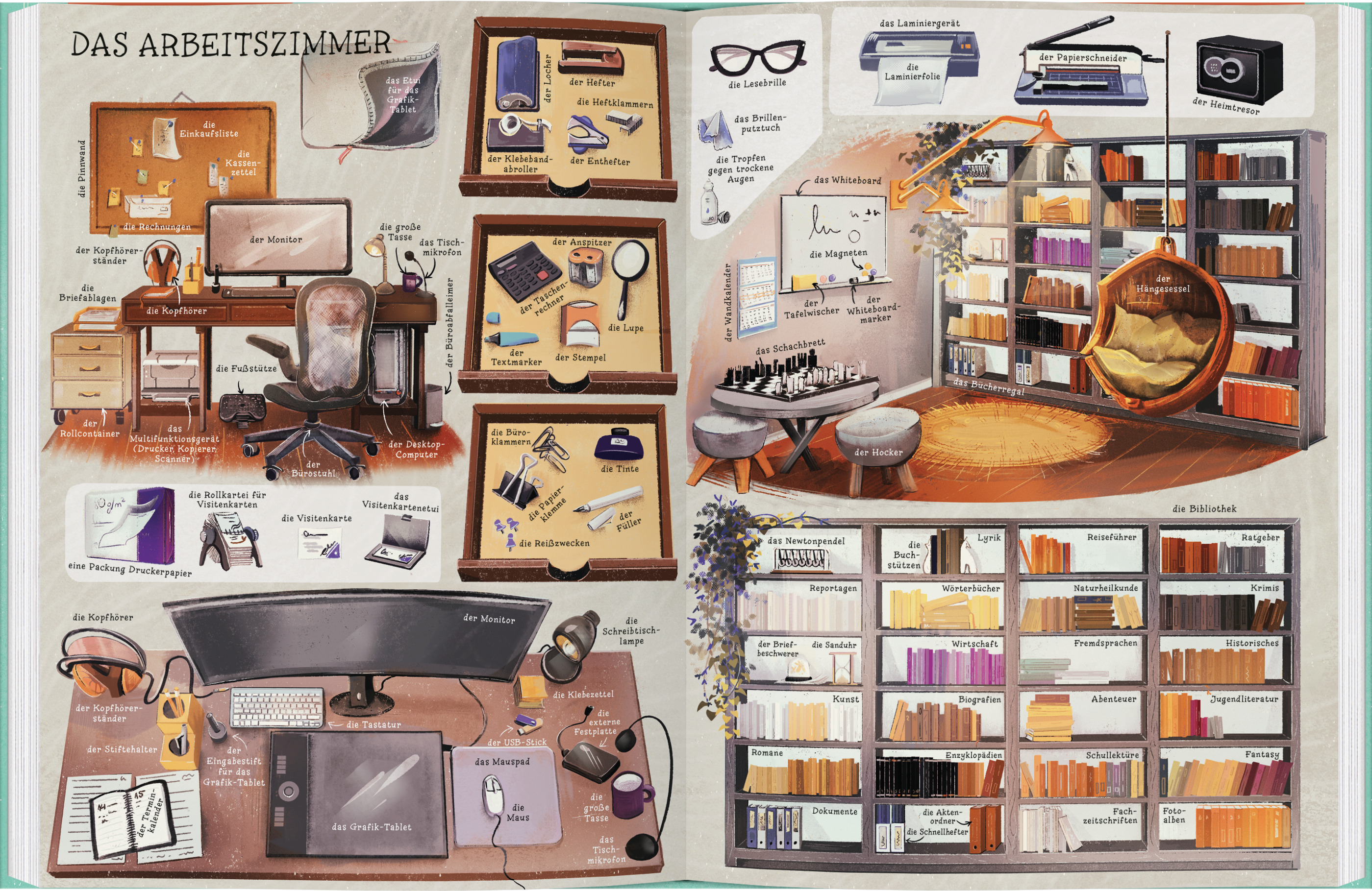 Das opulent illustrierte Bildwörterbuch zeigt uns sehr detailliert ein Haus und seine Einrichtung auf farbigen Doppelseiten. Alle Gegenstände sind genau und mit bestimmtem Artikel bezeichnet.