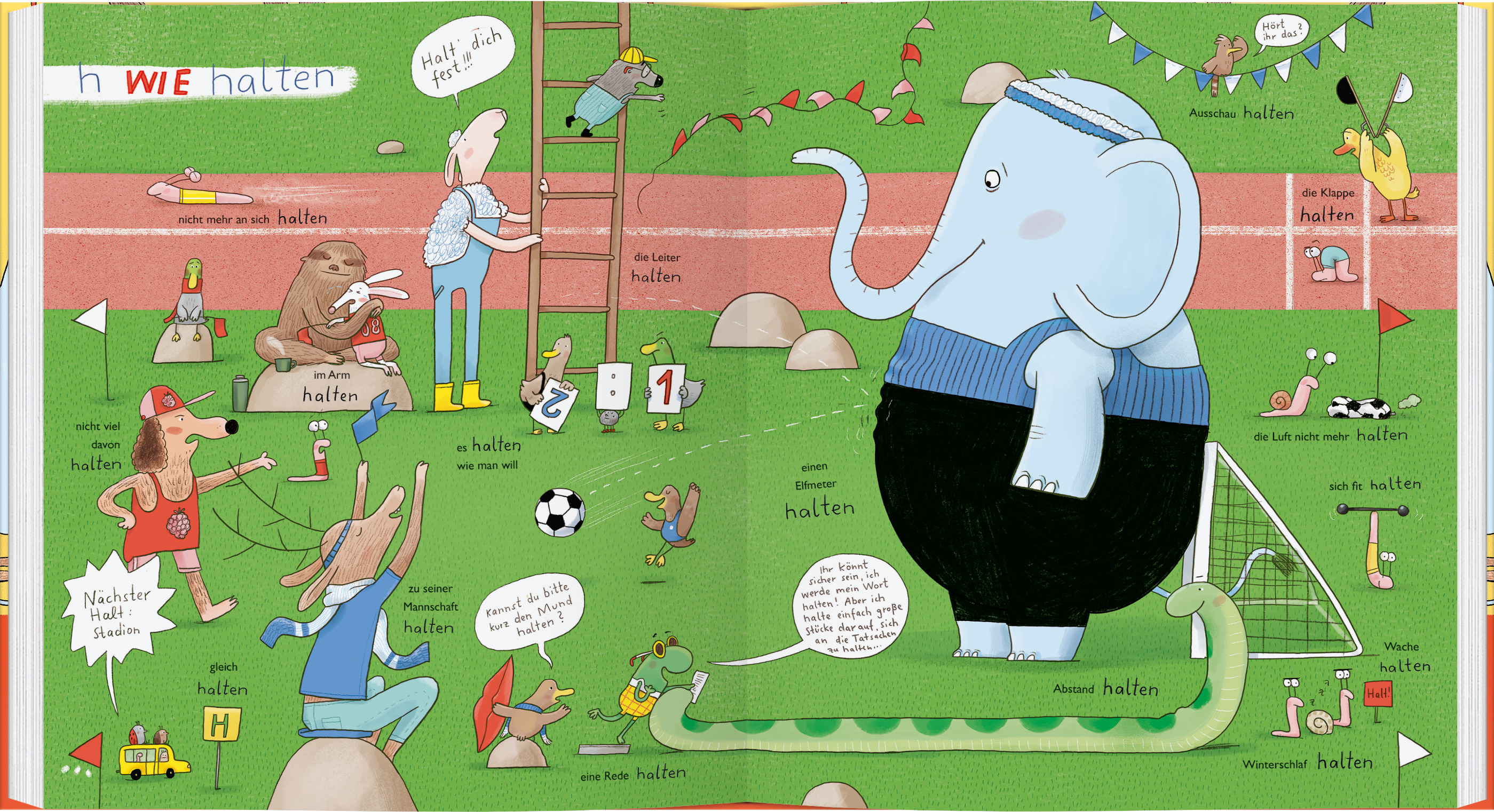 Wortschatzerweiterung mit Wortwitz - auf jeder Doppelseite dieses Bilderbuchs werden Redewendungen rund um ein Verb mit einer verrückten Tierbande illustriert und das quer durch das ABC. Macht Spaß und schlau!