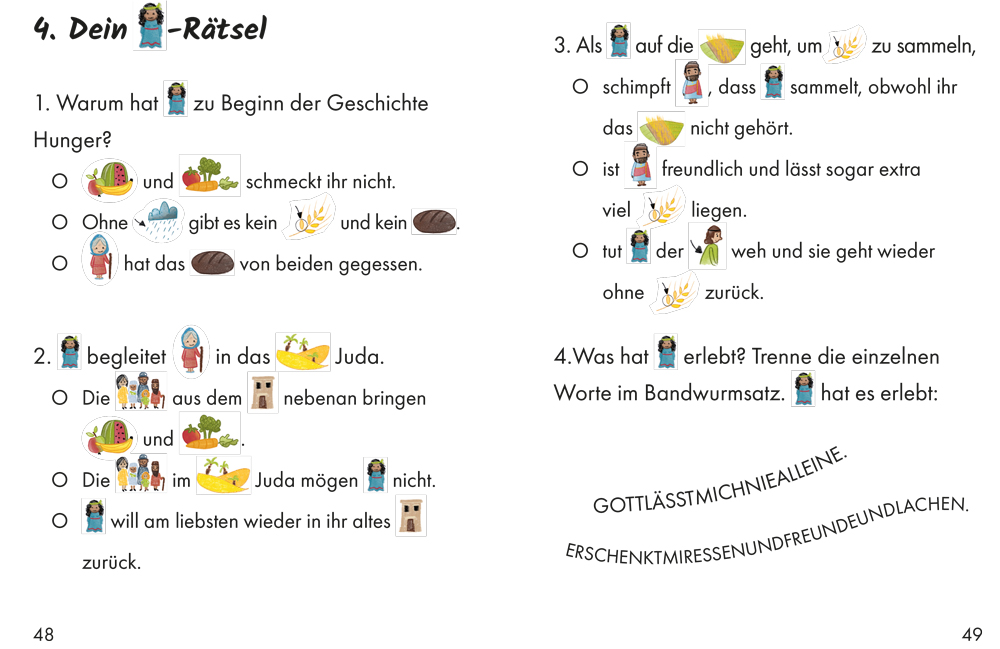 Aus frischer Perspektive wird die biblische Geschichte von Rut für den Leseanfang (ab 5 Jahren) nacherzählt. Die wichtigsten Hauptwörter werden im Text durch Bilder ersetzt, sodass Eltern und Kinder die Geschichte gemeinsam entdecken.