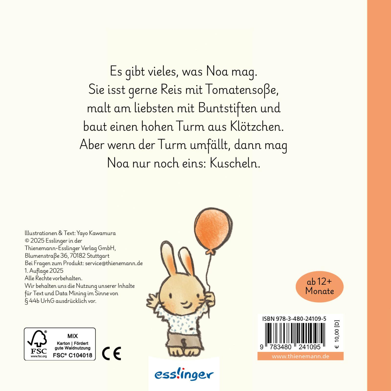 Es gibt so vieles, was Häschen Noa gerne mag: Noa isst gerne Reis mit Tomatensoße, Noa malt gerne mit Buntstiften, Noa baut gerne einen Turm aus Klötzchen ... aber wenn der Turm umfällt, dann mag Noa das überhaupt nicht. Dann gibt es nur noch eins, dass Noa machen möchte: mit Mama kuscheln.