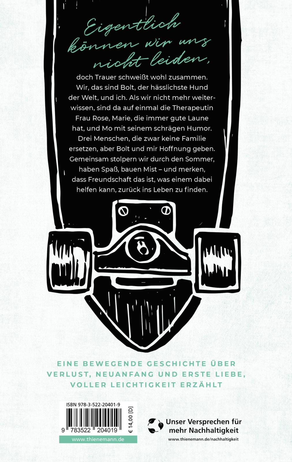 | Schlagworte | Angst • Coming-of-age • Depression • Erste Liebe • Erwachsen werden • Familienhund • Flucht • Freundschaft • Humor • Hund • Jugendbuch • Liebe • lustig • Psychotherapie • Romantik • Skateboard • Sommer • Sterben • tödlicher Autounfall • Trauer • Waise • Wut |