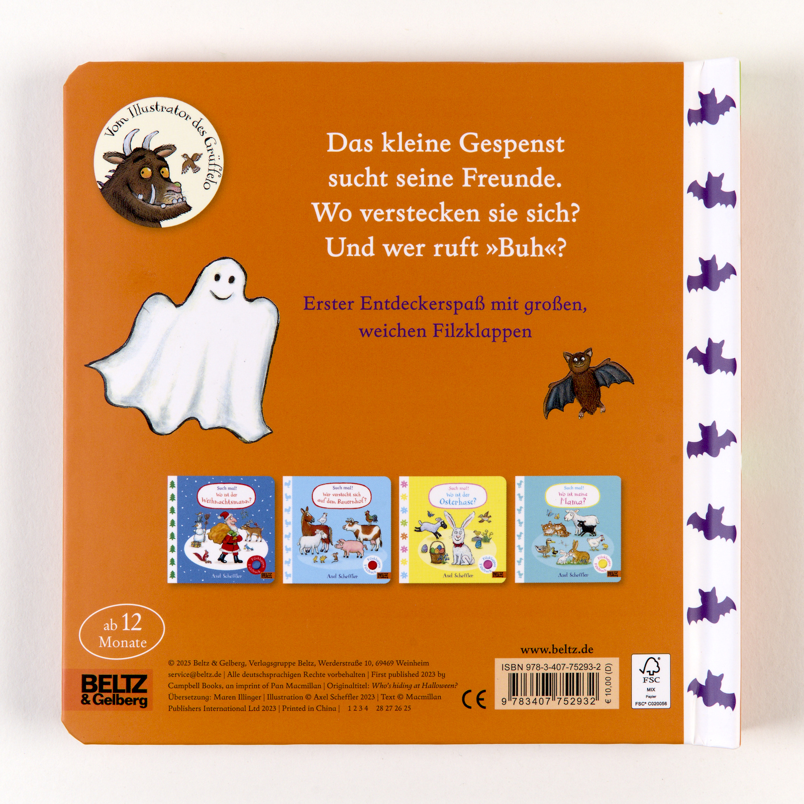 | Schlagworte | Aktivitätsbuch • Bilderbücher ab 12 Monate • Entdeckerspaß • Filzklappen • Fühlbuch • Grüffelo • Grusel • Herbst • Kinderbücher ab 12 Monate • Kleinkind • Mitmachbuch • Mitmachspaß • Oktober • Pappbilderbuch ab 12 Monate • Spielbuch • Spielpappe • Tiere |